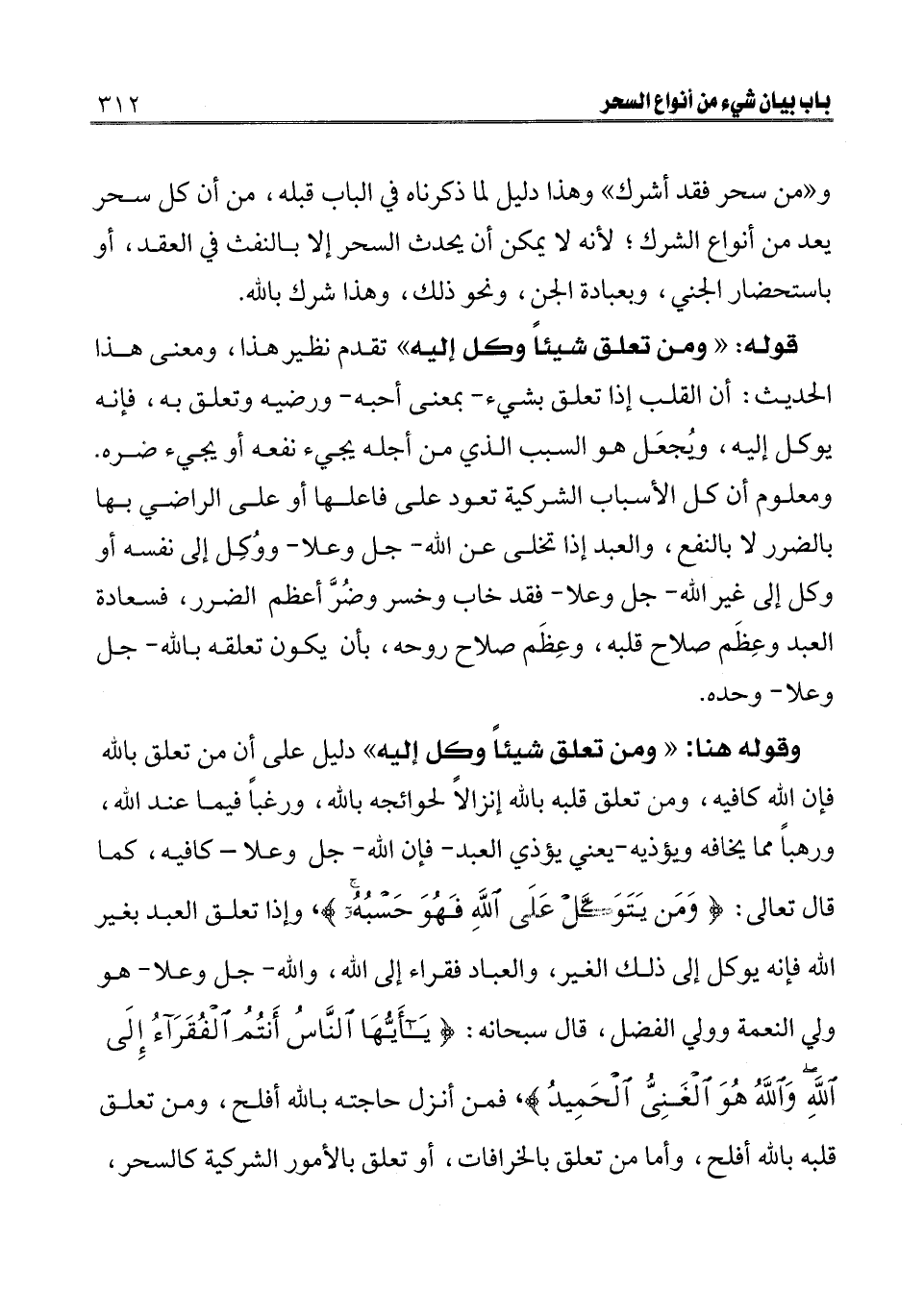 ـــــــــــــــــــــــــــــQو"من سحر فقد أشرك " وهذا دليل لما ذكرناه في الباب قبله، من أن كل سحر يعد من أنواع الشرك؛ لأنه لا يمكن أن يحدث السحر إلا بالنفث في العقد، أو باستحضار الجني، وبعبادة الجن، ونحو ذلك، وهذا شرك بالله.