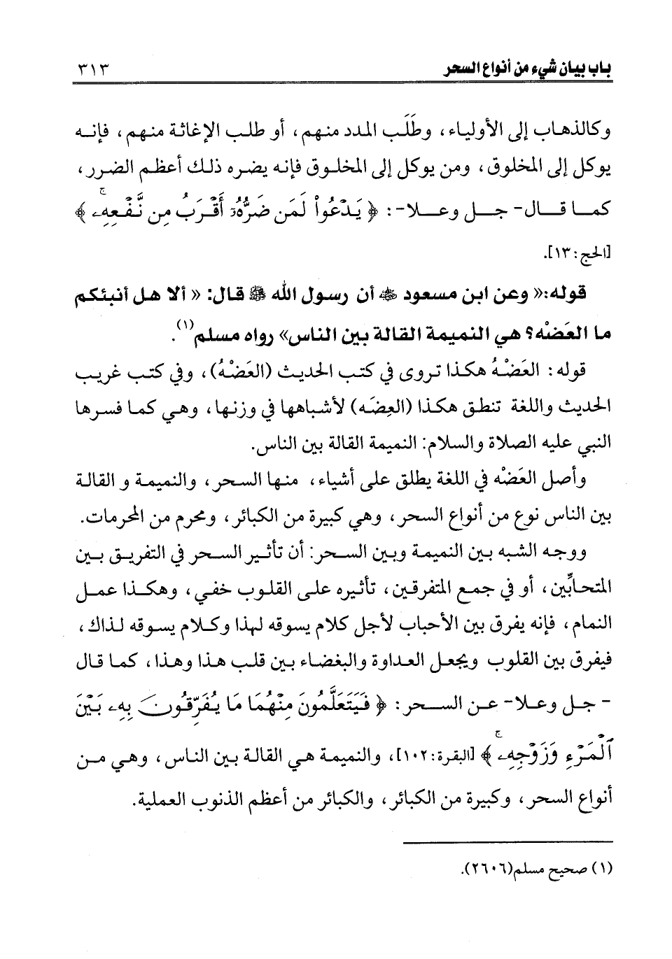 وأصل العضه في اللغة يطلق على أشياء، منها السحر، والنميمة والقالة بين الناس نوع من أنواع السحر، وهي كبيرة من الكبائر، ومحرم من المحرمات. ووجه الشبه بين النميمة وبين السحر: أن تأثير السحر في التفريق بين المتحابين، أو في جمع المتفرقين، تأثيره على القلوب خفي، وهكذا عمل النمام، فإنه يفرق بين الأحباب لأجل كلام يسوقه لهذا وكلام يسوقه لذاك، فيفرق بين القلوب ويجعل العداوة والبغضاء بين قلب هذا وهذا، كما قال - جل وعلا- عن السحر: {فَيَتَعَلَّمُونَ مِنْهُمَا مَا يُفَرِّقُونَ بِهِ بَيْنَ الْمَرْءِ وَزَوْجِهِ} [البقرة: 102] [البقرة: 102] ، والنميمة هي القالة بين الناس، وهي من أنواع السحر، وكبيرة من الكبائر، والكبائر من أعظم الذنوب العملية.