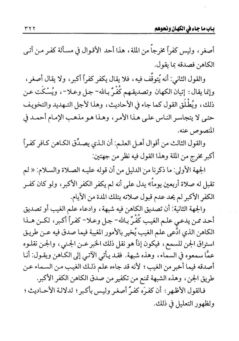والقول الثاني. أنه يتوقف فيه، فلا يقال يكفر كفرا أكبر، ولا يقال أصغر، وإنما يقال: إتيان الكهان وتصديقهم كفر بالله- جل وعلا-، ويسكت عن ذلك، ويطلق القول كما جاء في الأحاديث، وهذا لأجل التهديد والتخويف حتى لا يتجاسر الناس على هذا الأمر، وهذا هو مذهب الإمام أحمد في المنصوص عنه.
