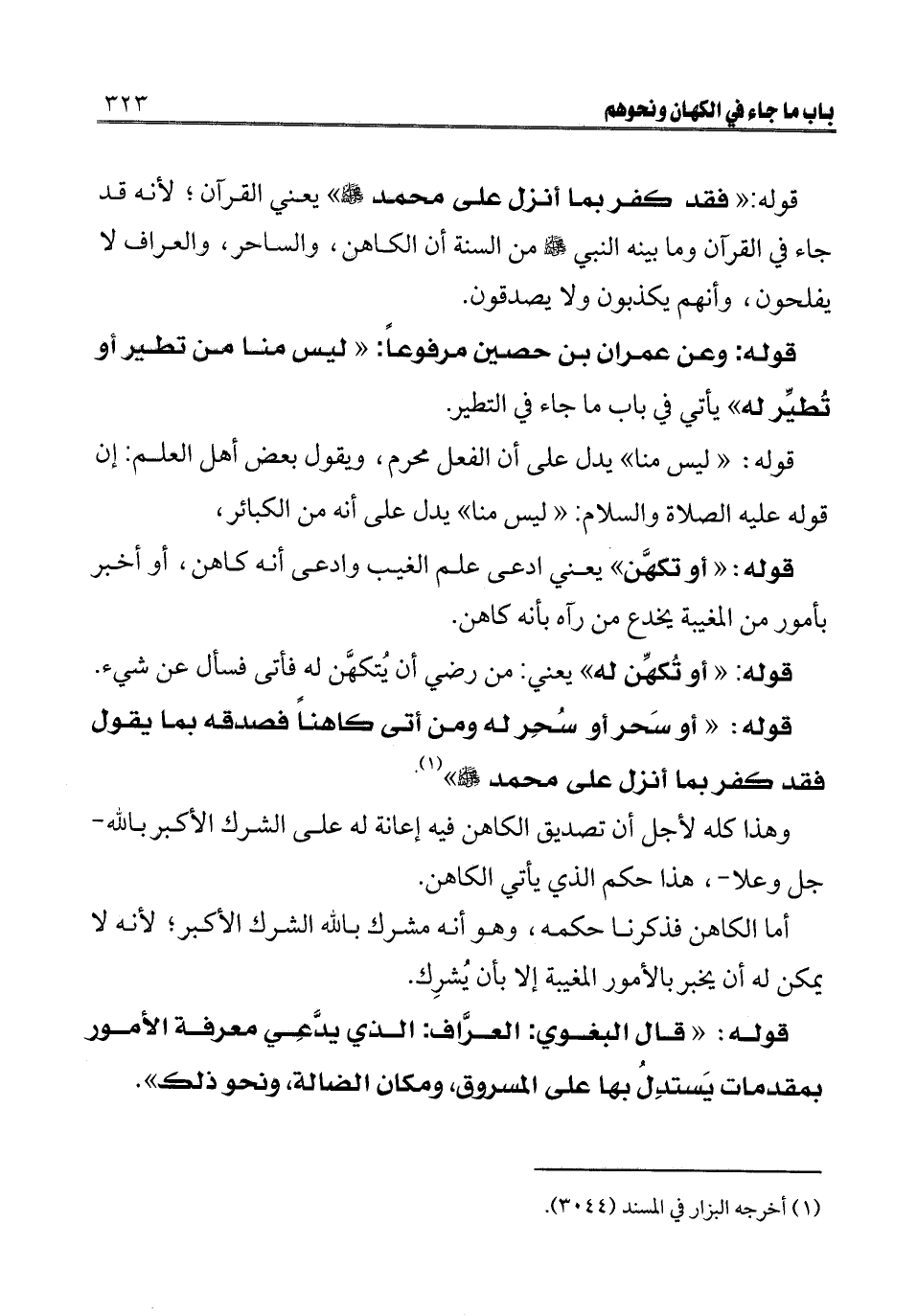 قوله: وعن عمران بن حصين مرفوعا: «ليس منا من تطير أو تطير له» يأتي في باب ما جاء في التطير.