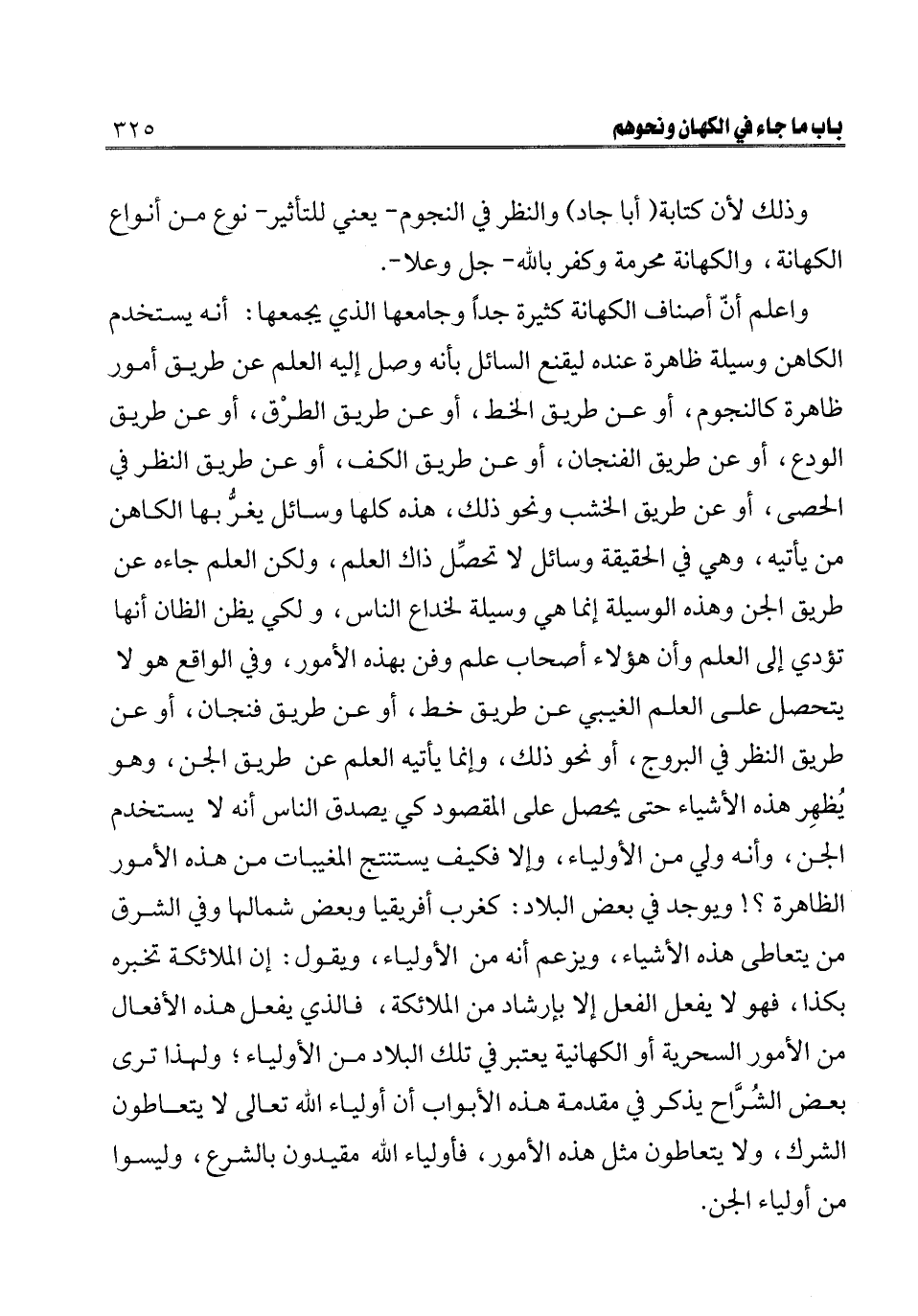 واعلم أن أصناف الكهانة كثيرة جدا وجامعها الذي يجمعها: أنه يستخدم الكاهن وسيلة ظاهرة عنده ليقنع السائل بأنه وصل إليه العلم عن طريق أمور ظاهرة كالنجوم، أو عن طريق الخط، أو عن طريق الطرق، أو عن طريق الفنجان، أو عن طريق الكف، أو عن طريق النظر في الحصى، أو عن طريق الخشب ونحو ذلك، هذه كلها وسائل يغر بها الكاهن من يأتيه، وهي في الحقيقة وسائل لا تحصل ذاك العلم، ولكن العلم جاءه عن طريق الجن وهذه الوسيلة إنما هي وسيلة لخداع الناس، ولكي يظن الظان أنها تؤدي إلى العلم وأن هؤلاء أصحاب علم وفن بهذه الأمور، وفي الواقع هو لا يتحصل على العلم الغيبي عن طريق خط، أو عن طريق فنجان، أو عن طريق النظر في البروج، أو نحو ذلك، وإنما يأتيه العلم عن طريق الجن، وهو يظهر هذه الأشياء حتى يحصل على المقصود كي يصدق الناس أنه لا يستخدم الجن، وأنه ولي من الأولياء، وإلا فكيف يستنتج المغيبات من هذه الأمور الظاهرة؟! ويوجد في بعض البلاد: كغرب أفريقيا وبعض شمالها وفي الشرق من يتعاطى هذه الأشياء، ويزعم أنه من الأولياء، ويقول: إن الملائكة تخبره بكذا، فهو لا يفعل الفعل إلا بإرشاد من الملائكة، فالذي يفعل هذه الأفعال من الأمور السحرية أو الكهانة يعتبر في تلك البلاد من الأولياء؛ ولهذا ترى بعض الشراح يذكر في مقدمة هذه الأبواب أن أولياء الله تعالى لا يتعاطون الشرك، ولا يتعاطون مثل هذه الأمور، فأولياء الله مقيدون بالشرع، وليسوا من أولياء الجن.