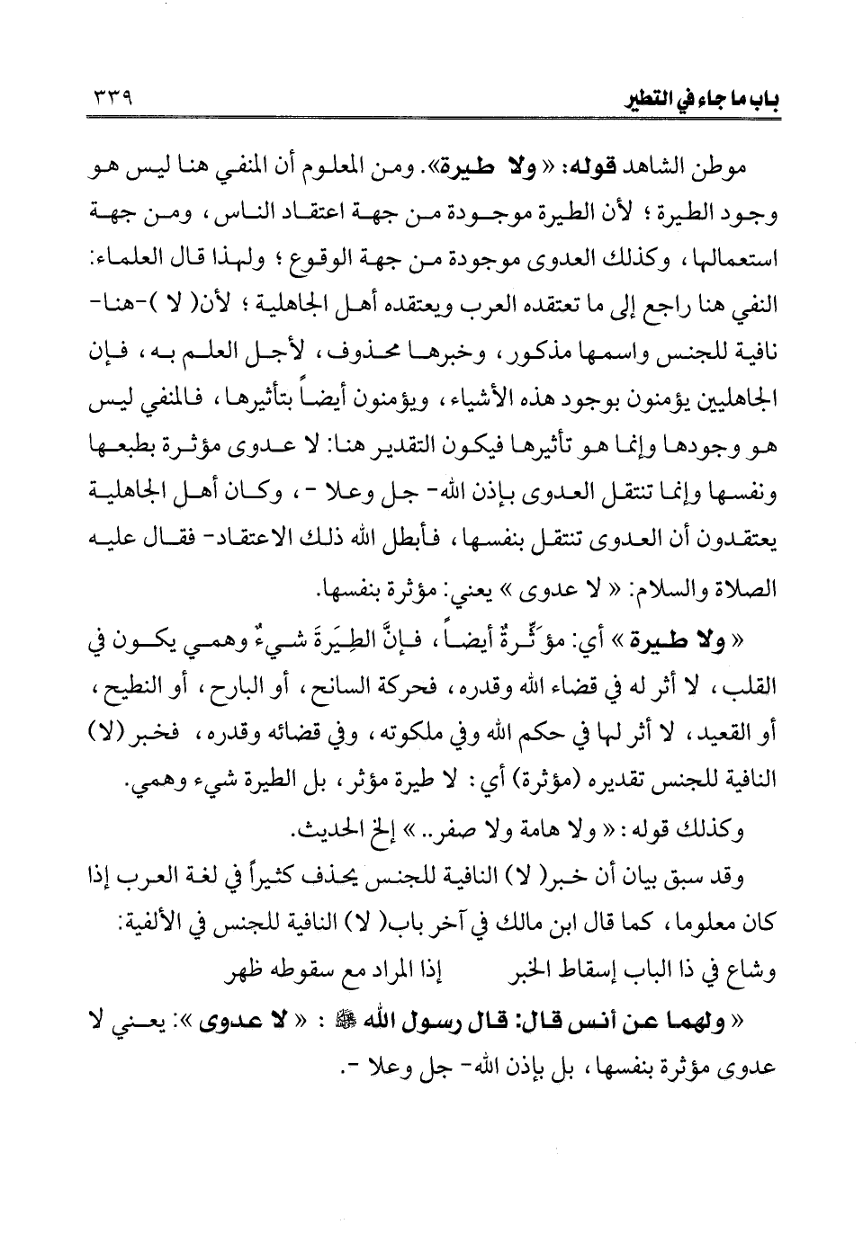 ـــــــــــــــــــــــــــــQموطن الشاهد قوله: «ولا طيرة» . ومن المعلوم أن المنفي هنا ليس هو وجود الطيرة؛ لأن الطيرة موجودة من جهة اعتقاد الناس، ومن جهة استعمالها، وكذلك العدوى موجودة من جهة الوقوع؛ ولهذا قال العلماء: النفي هنا راجع إلى ما تعتقده العرب ويعتقده أهل الجاهلية؛ لأن (لا) - هنا- نافية للجنس واسمها مذكور، وخبرها محذوف، لأجل العلم به، فإن الجاهليين يؤمنون بوجود هذه الأشياء، ويؤمنون أيضا بتأثيرها، فالمنفي ليس هو وجودها وإنما هو تأثيرها فيكون التقدير هنا: لا عدوى مؤثرة بطبعها ونفسها وإنما تنتقل العدوى بإذن الله- جل وعلا-، وكان أهل الجاهلية يعتقدون أن العدوى تنتقل بنفسها، فأبطل الله ذلك الاعتقاد- فقال -عليه الصلاة والسلام-. " لا عدوى " يعني: مؤثرة بنفسها.