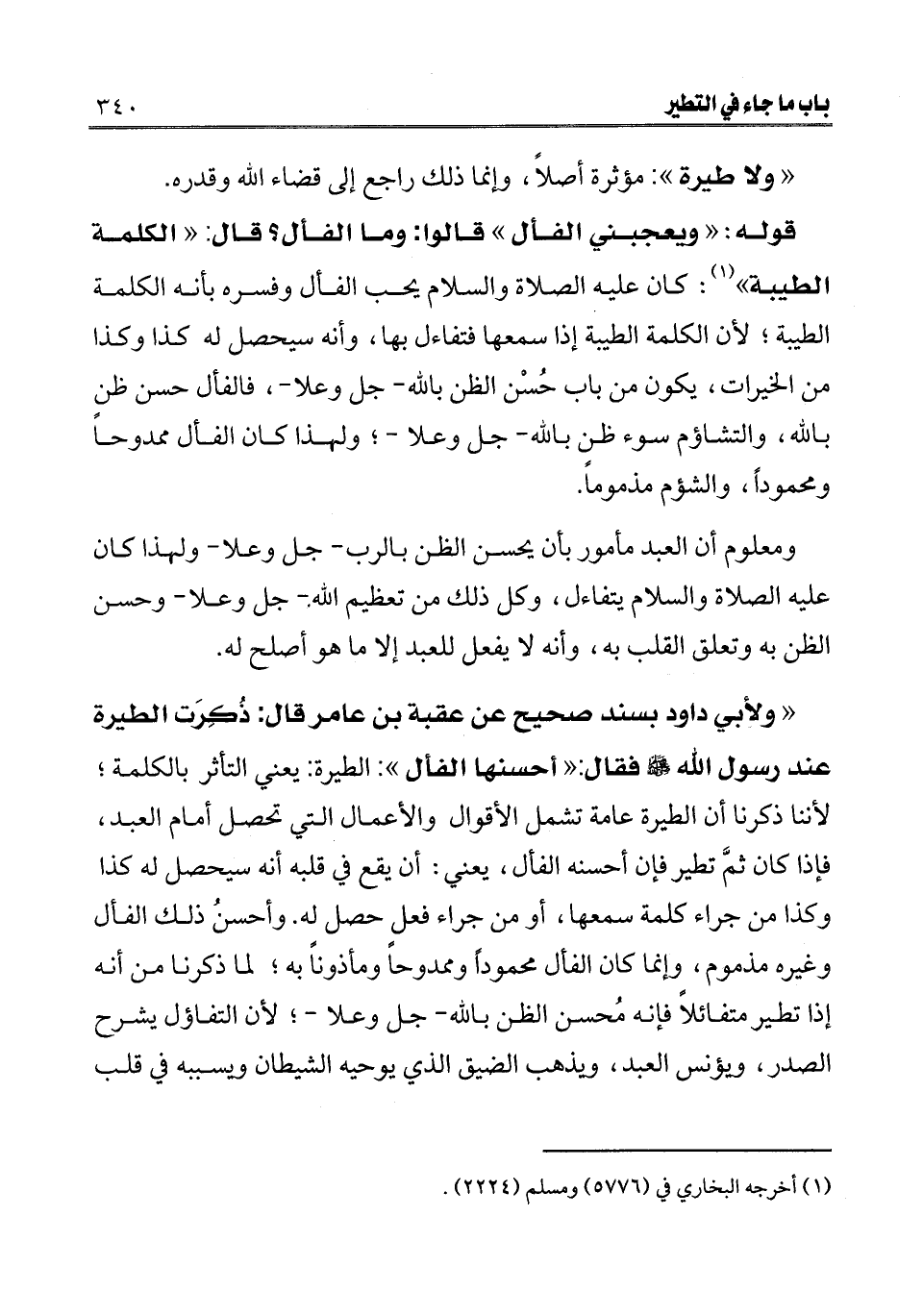 " ولأبي داود بسند صحيح عن عقبة بن عامر قال: «ذكرت الطيرة عند رسول الله صلى الله عليه وسلم فقال: " أحسنها الفأل» . الطيرة: يعني التأثر بالكلمة؛ لأننا ذكرنا أن الطيرة عامة تشمل الأقوال والأعمال التي تحصل أمام العبد، فإذا كان ثم تطير فإن أحسنه الفأل، يعني: أن يقع في قلبه أنه سيحصل له كذا وكذا من جراء كلمة سمعها، أو من جراء فعل حصل له. وأحسن ذلك الفأل وغيره مذموم، وإنما كان الفأل محمودا وممدوحا ومأذونا به؛ لما ذكرنا من أنه إذا تطير متفائلا فإنه محسن الظن بالله- جل وعلا- لأن التفاؤل يشرح الصدر، ويؤنس العبد، ويذهب الضيق الذي يوحيه الشيطان ويسببه في قلب