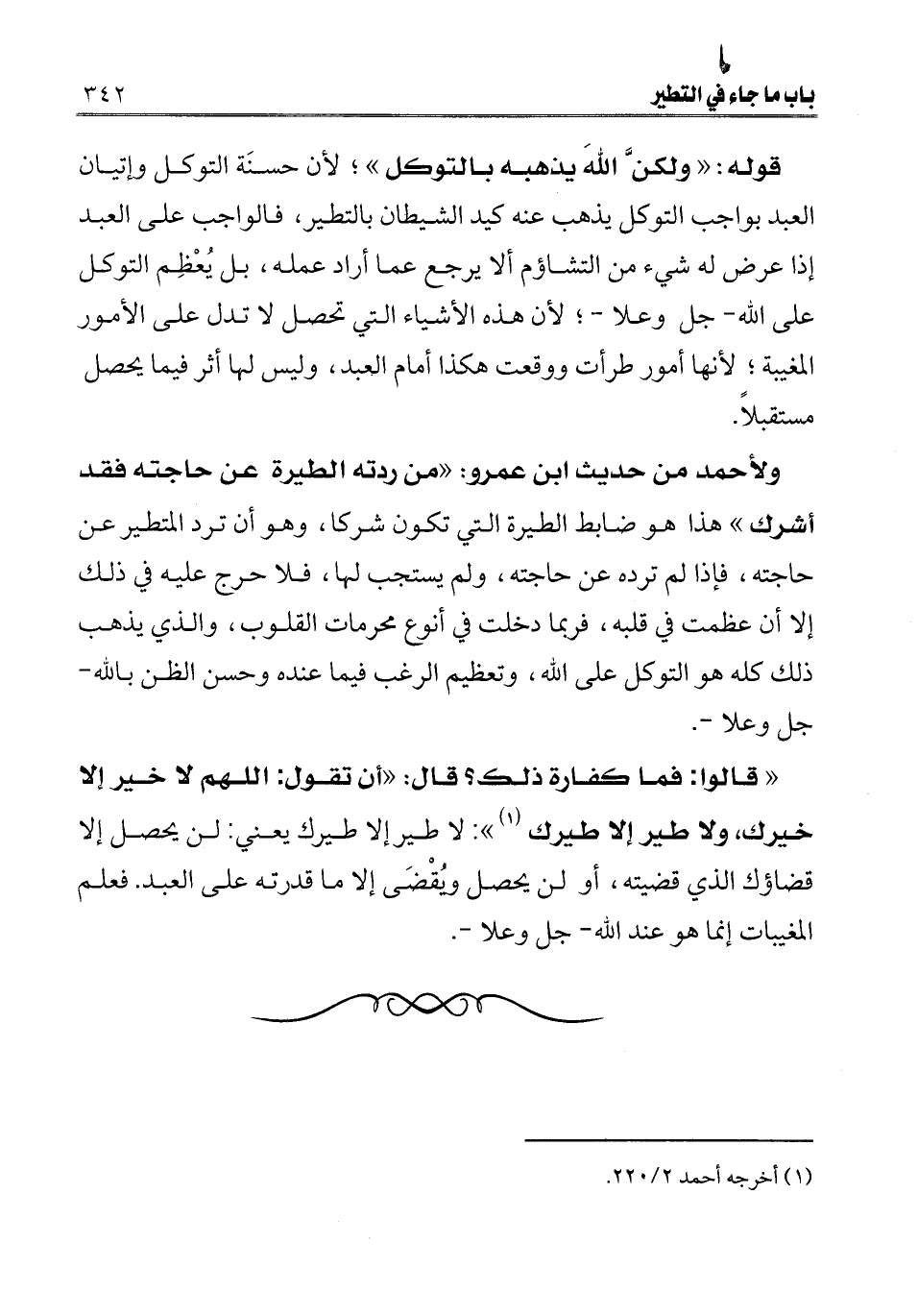 ولأحمد من حديث ابن عمرو: «من ردته الطيرة عن حاجته فقد أشرك» هذا هو ضابط الطيرة التي تكون شركا، وهو أن ترد المتطير عن حاجته، فإذا لم ترده عن حاجته، ولم يستجب لها، فلا حرج عليه وبذلك إلا أن عظمت في قلبه، فربما دخلت في أنوع محرمات القلوب، الذي يذهب ذلك كله هو التوكل على الله، وتعظيم الرغب فيما عنده وحسن الظن بالله - جل وعلا-.