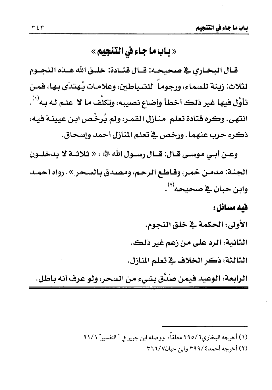 " باب ما جاء في التنجيم " قال البخاري في صحيحه: قال قتادة: خلق الله هذه النجوم لثلاث: زينة للسماء، ورجوما للشياطين وعلامات يهتدى بها، فمن تأول فيها غير ذلك أخطأ وأضاع نصيبه، وتكلف ما لا علم له به (¬1) . انتهى. وكره قتادة تعلم منازل القمر ولم يرخص ابن عيينة فيه، ذكره حرب عنهما. ورخص في تعلم المنازل أحمد وإسحاق.