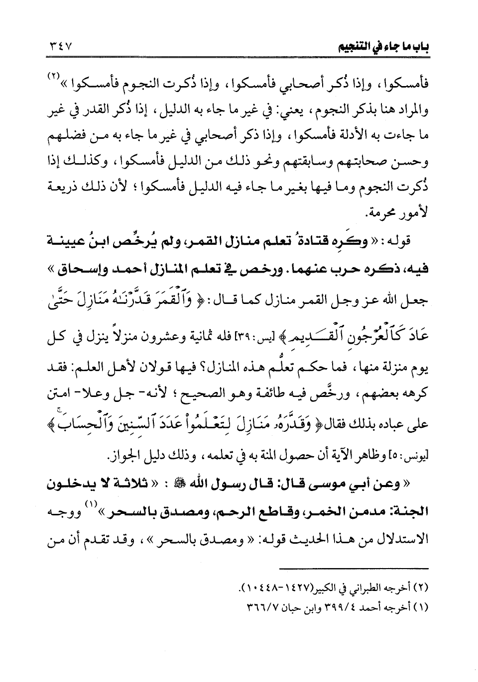 قوله: " وكره قتادة تعلم منازل القمر، ولم يرخص ابن عيينة فيه، ذكره حرب عنهما. ورخص في تعلم المنازل أحمد وإسحاق "