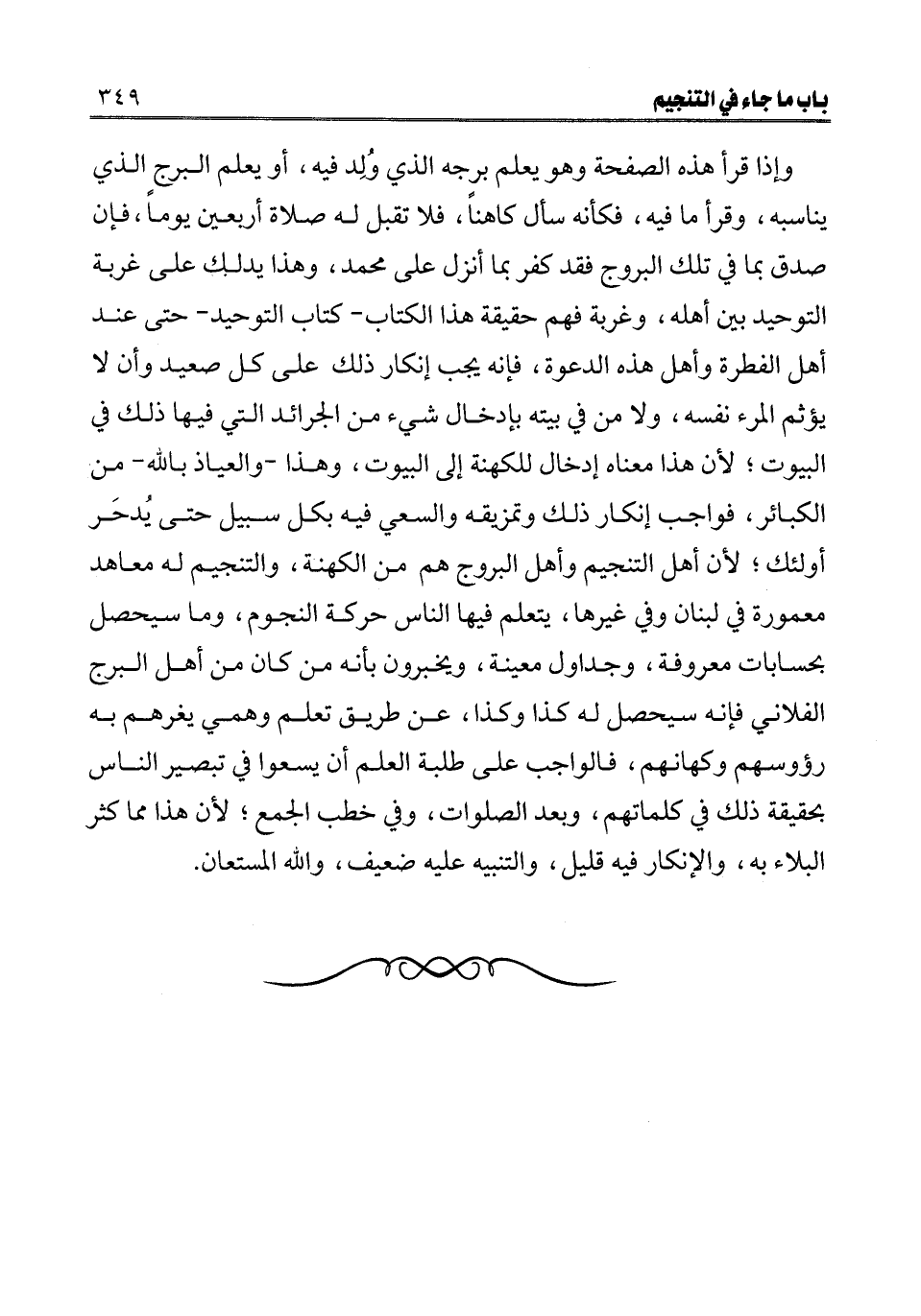 ـــــــــــــــــــــــــــــQوإذا قرأ هذه الصفحة وهو يعلم برجه الذي ولد فيه، أو يعلم البرج الذي يناسبه، وقرأ ما فيه، فكأنه سأل كاهنا، فلا تقبل له صلاة أربعين يوما، فإن صدق بما في تلك البروج فقد كفر بما أنزل على محمد، وهذا يدلك على غربة التوحيد بين أهله، وغربة فهم حقيقة هذا الكتاب- كتاب التوحيد- حتى عند أهل الفطرة وأهل هذه الدعوة، فإنه يجب إنكار ذلك على كل صعيد وأن لا يؤثم المرء نفسه، ولا من في بيته بإدخال شيء من الجرائد التي فيها ذلك في البيوت؛ لأن هذا معناه إدخال للكهنة إلى البيوت، وهذا- والعياذ بالله- من الكبائر، فواجب إنكار ذلك وتمزيقه والسعي فيه بكل سبيل حتى يدحر أولئك؛ لأن أهل التنجيم وأهل البروج هم من الكهنة، والتنجيم له معاهد معمورة في لبنان وفي غيرها، يتعلم فيها الناس حركة النجوم، وما سيحصل بحسابات معروفة، وجداول معينة، ويخبرون بأنه من كان من أهل البرج الفلاني فإنه سيحصل له كذا وكذا، عن طريق تعلم وهمي يغرهم به رؤوسهم وكهانهم، فالواجب على طلبة العلم أن يسعوا في تبصير الناس بحقيقة ذلك في كلماتهم، وبعد الصلوات، وفي خطب الجمعة؛ لأن هذا مما كثر البلاء به، والإنكار فيه قليل، والتنبيه عليه ضعيف، والله المستعان.