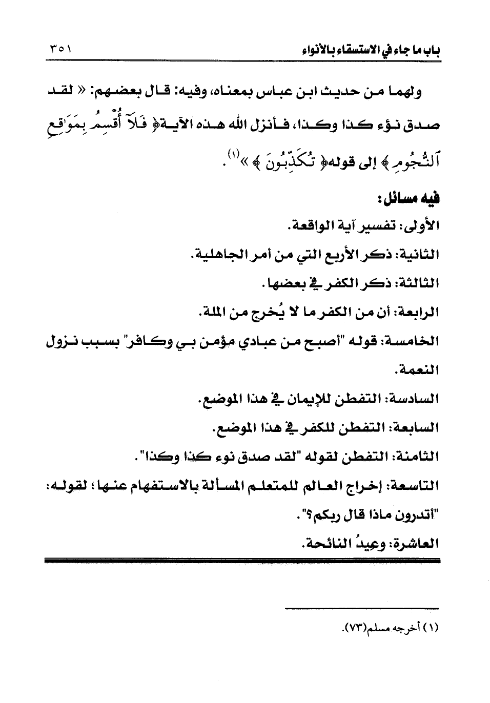 ولهما من حديث ابن عباس بمعناه، وفيه: قال بعضهم: " لقد صدق نوء كذا وكذا، فأنزل الله هذه الآية {فَلَا أُقْسِمُ بِمَوَاقِعِ النُّجُومِ} [الواقعة: 75] إلى قوله {تُكَذِّبُونَ} [الواقعة: 82] (¬1) .