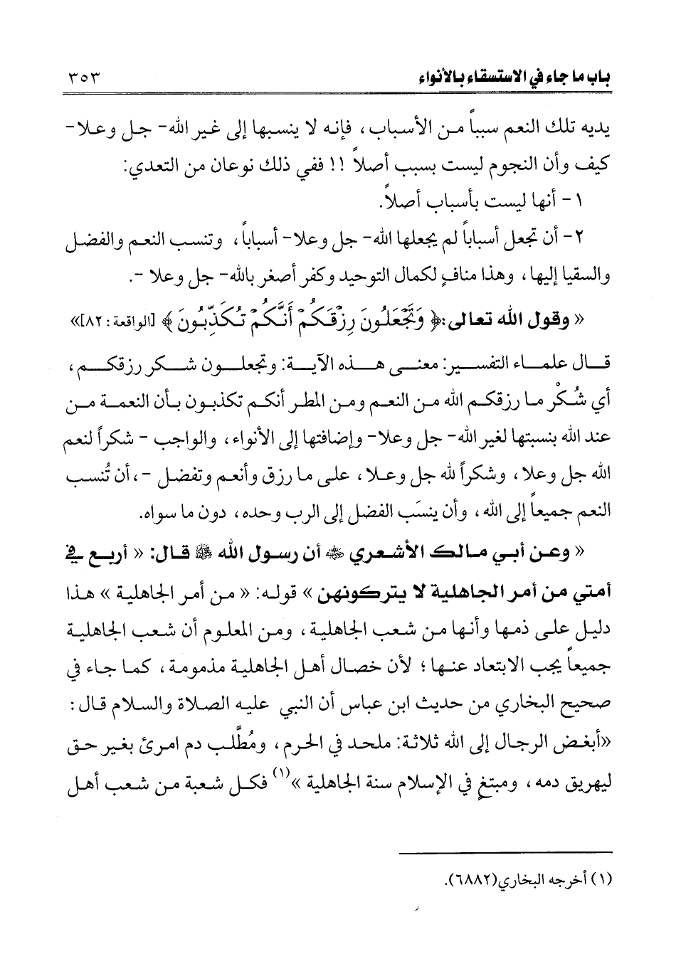 ـــــــــــــــــــــــــــــQيديه تلك النعم سببا من الأسباب، فإنه لا ينسبها إلى غير الله- جل وعلا- كيف وأن النجوم ليست بسبب أصلا. ففي ذلك نوعان من التعدي: