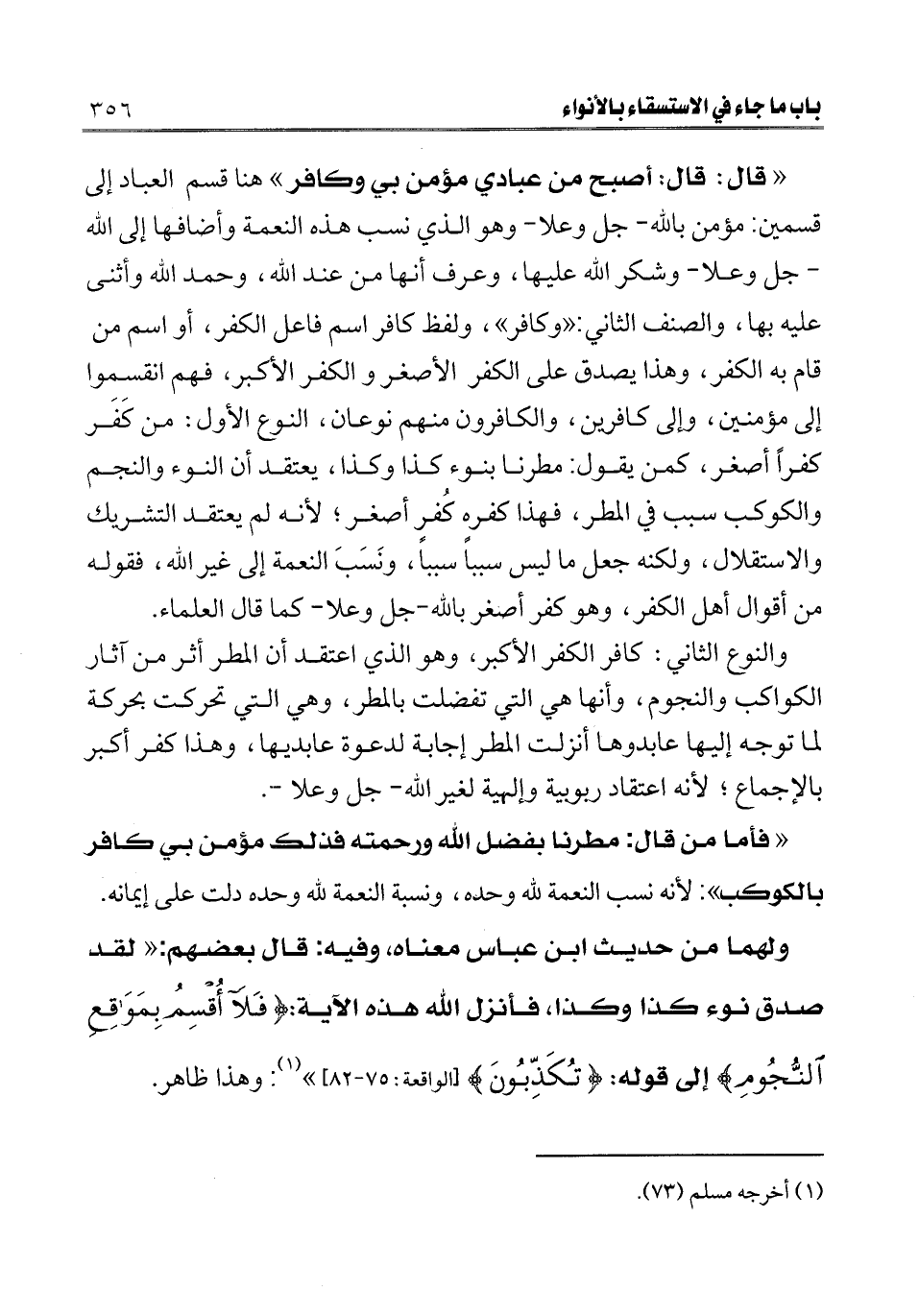 ـــــــــــــــــــــــــــــQ" قال: قال: أصبح من عبادي مؤمن بي وكافر" هنا قسم العباد إلى قسمين: مؤمن بالله- جل وعلا- وهو الذي نسب هذه النعمة وأضافها إلى الله - جل وعلا- وشكر الله عليها، وعرف أنها من عند الله، وحمد الله وأثنى عليه بها، والصنف الثاني: "وكافر"، ولفظ كافر اسم فاعل الكفر، أو اسم من قام به الكفر، وهذا يصدق على الكفر الأصغر والكفر الأكبر، فهم انقسموا إلى مؤمنين، وإلى كافرين، والكافرون منهم نوعان: النوع الأول: من كفر كفرا أصغر، كمن يقول: مطرنا بنوء كذا وكذا، يعتقد أن النوء والنجم والكوكب سبب في المطر، فهذا كفره كفر أصغر؛ لأنه لم يعتقد التشريك والاستقلال، ولكنه جعل ما ليس سببا سببا، ونسب النعمة إلى غير الله، فقوله من أقوال أهل الكفر، وهو كفر أصغر بالله- جل وعلا- كما قال العلماء. والنوع الثاني: كافر الكفر الأكبر، وهو الذي اعتقد أن المطر أثر من آثار الكواكب والنجوم، وأنها هي التي تفضلت بالمطر، وهي التي تحركت بحركة لما توجه إليها عابدوها أنزلت المطر إجابة لدعوة عابديها، وهذا كفر أكبر بالإجماع؛ لأنه اعتقاد ربوبية وإلهية لغير الله- جل وعلا-.