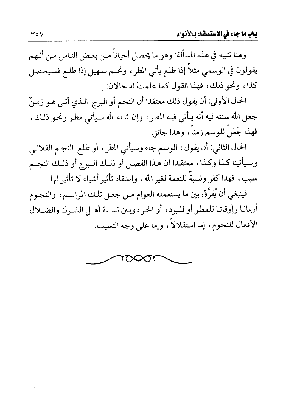 ـــــــــــــــــــــــــــــQوهنا تنبيه في هذه المسألة: وهو ما يحصل أحيانا من بعض الناس من أنهم يقولون في الوسمي مثلا إذا طلع يأتي المطر، ونجم سهيل إذا طلع فسيحصل كذا، ونحو ذلك، فهذا القول كما علمت له حالان.