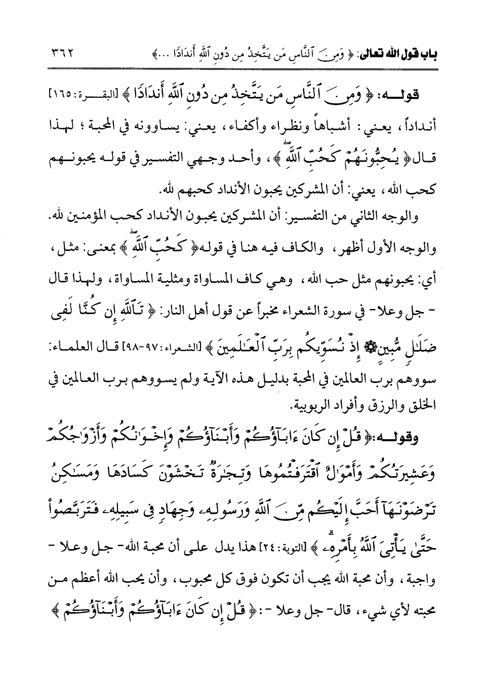 وقوله: {قُلْ إِنْ كَانَ آبَاؤُكُمْ وَأَبْنَاؤُكُمْ وَإِخْوَانُكُمْ وَأَزْوَاجُكُمْ وَعَشِيرَتُكُمْ وَأَمْوَالٌ اقْتَرَفْتُمُوهَا وَتِجَارَةٌ تَخْشَوْنَ كَسَادَهَا وَمَسَاكِنُ تَرْضَوْنَهَا أَحَبَّ إِلَيْكُمْ مِنَ اللَّهِ وَرَسُولِهِ وَجِهَادٍ فِي سَبِيلِهِ فَتَرَبَّصُوا حَتَّى يَأْتِيَ اللَّهُ بِأَمْرِهِ} [التوبة: 24] [التوبة: 24] هذا يدل على أن محبة الله- جل وعلا- واجبة، وأن محبة الله يجب أن تكون فوق كل محبوب، وأن محبة الله أعظم من محبته لأي شيء، قال- جل وعلا-: {قُلْ إِنْ كَانَ آبَاؤُكُمْ وَأَبْنَاؤُكُمْ} [التوبة: 24]