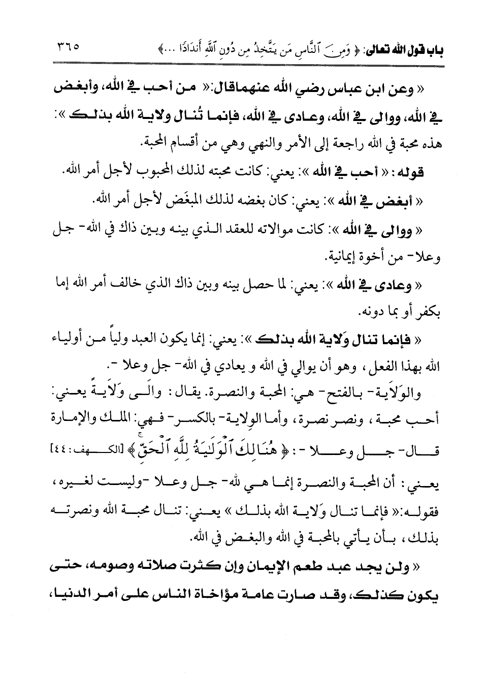 ـــــــــــــــــــــــــــــQ" وعن ابن عباس -رضي الله عنهما- قال: " من أحب في الله، وأبغض في الله، ووالى في الله، وعادى في الله، فإنما تنال ولاية الله بذلك ":
