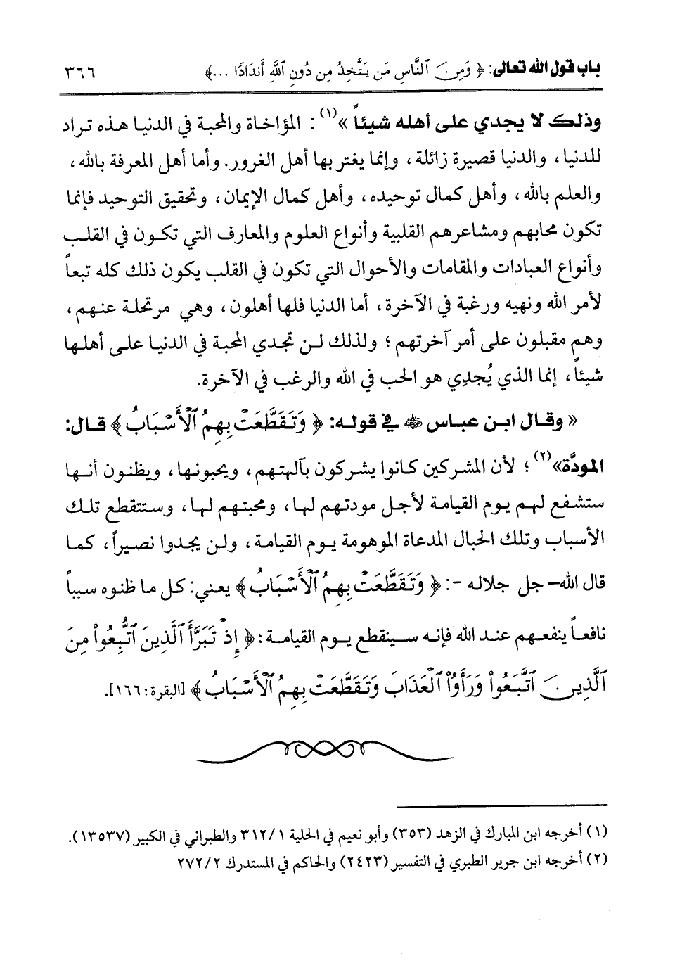 " وقال ابن عباس -رضي الله عنه- في قوله {وَتَقَطَّعَتْ بِهِمُ الْأَسْبَابُ} [البقرة: 166] قال: المودة " (¬2) ؛ لأن المشركين كانوا يشركون بآلهتهم، ويحبونها، ويظنون أنها ستشفع لهم يوم القيامة لأجل مودتهم لها، ومحبتهم لها، وستتقطع تلك الأسباب وتلك الحبال المدعاة الموهومة يوم القيامة، ولن يجدوا نصيرا، كما قال الله -جل جلاله-: {وَتَقَطَّعَتْ بِهِمُ الْأَسْبَابُ} [البقرة: 166] يعني: كل ما ظنوه سببا نافعا عند الله فإنه سينقطع يوم القيامة: {إِذْ تَبَرَّأَ الَّذِينَ اتُّبِعُوا مِنَ الَّذِينَ اتَّبَعُوا وَرَأَوُا الْعَذَابَ وَتَقَطَّعَتْ بِهِمُ الْأَسْبَابُ} [البقرة: 166] [البقرة: 166] .