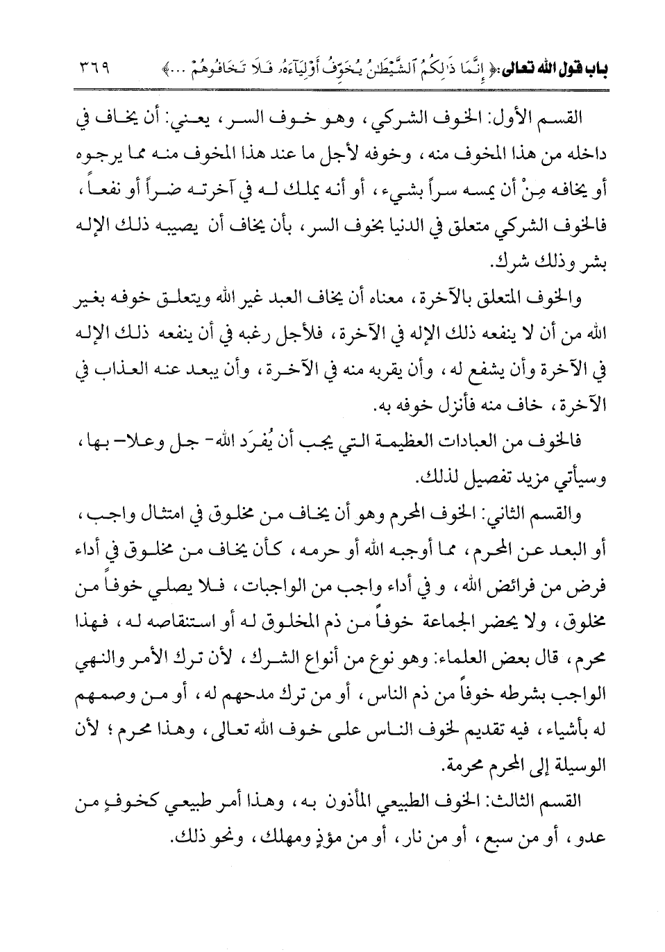 ـــــــــــــــــــــــــــــQالقسم الأول: الخوف الشركي، وهو خوف السر، يعني: أن يخاف في داخله من هذا المخوف منه، وخوفه لأجل ما عند هذا المخوف منه مما يرجوه أو يخافه من أن يمسه سرا بشيء، أو أنه يملك له في آخرته ضرا أو نفعا، فالخوف الشركي متعلق في الدنيا بخوف السر، بأن يخاف أن يصيبه ذلك الإله بشر وذلك شرك.