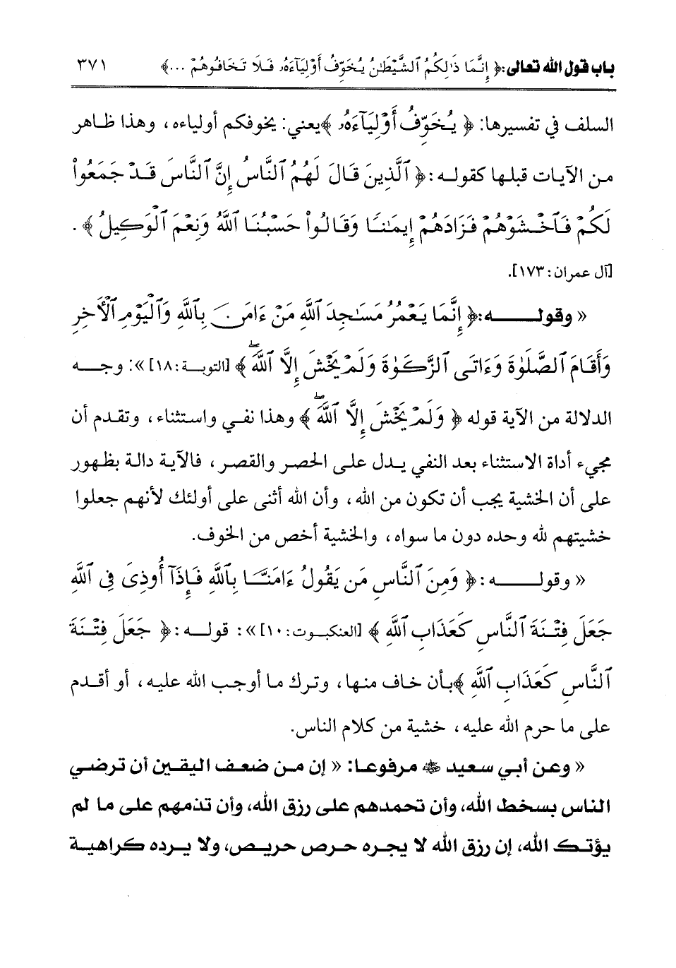 " وقوله: {إِنَّمَا يَعْمُرُ مَسَاجِدَ اللَّهِ مَنْ آمَنَ بِاللَّهِ وَالْيَوْمِ الْآخِرِ وَأَقَامَ الصَّلَاةَ وَآتَى الزَّكَاةَ وَلَمْ يَخْشَ إِلَّا اللَّهَ} [التوبة: 18] [التوبة: 18] : وجه الدلالة من الآية قوله {وَلَمْ يَخْشَ إِلَّا اللَّهَ} [التوبة: 18] وهذا نفي واستثناء، وتقدم أن مجيء أداة الاستثناء بعد النفي يدل على الحصر والقصر، فالآية دالة بظهور على أن الخشية يجب أن تكون من الله، وأن الله أثنى على أولئك لأنهم جعلوا خشيتهم لله وحده دون ما سواه، والخشية أخص من الخوف.