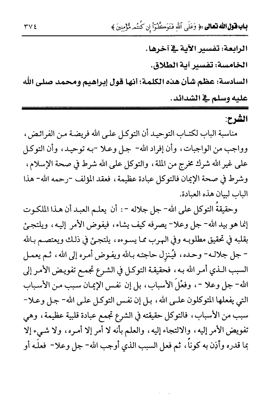 الخامسة: تفسير آية الطلاق. السادسة: عظم شأن هذه الكلمة؛ أنها قول إبراهيم ومحمد صلى الله عليه وسلم في الشدائد.