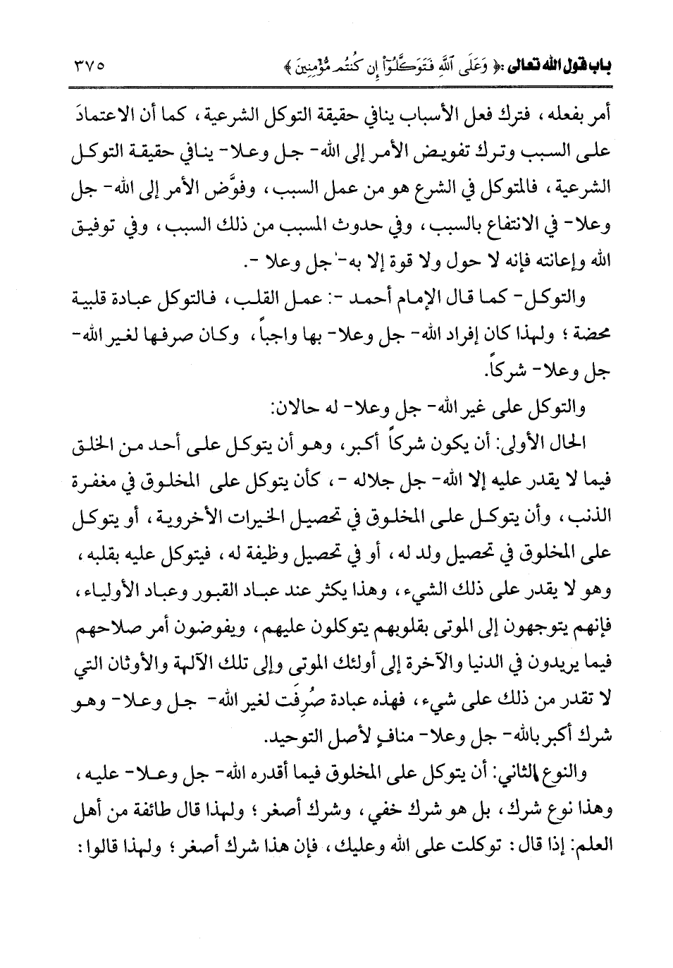 ـــــــــــــــــــــــــــــQأمر بفعله، فترك فعل الأسباب ينافي حقيقة التوكل الشرعية، كما أن الاعتماد على السبب وترك تفويض الأمر إلى الله- جل وعلا- ينافي حقيقة التوكل الشرعية، فالمتوكل في الشرع هو من عمل السبب، وفوض الأمر إلى الله- جل وعلا- في الانتفاع بالسبب، وفي حدوث المسبب من ذلك السبب، وفي توفيق الله وإعانته فإنه لا حول ولا قوة إلا به- جل وعلا-.