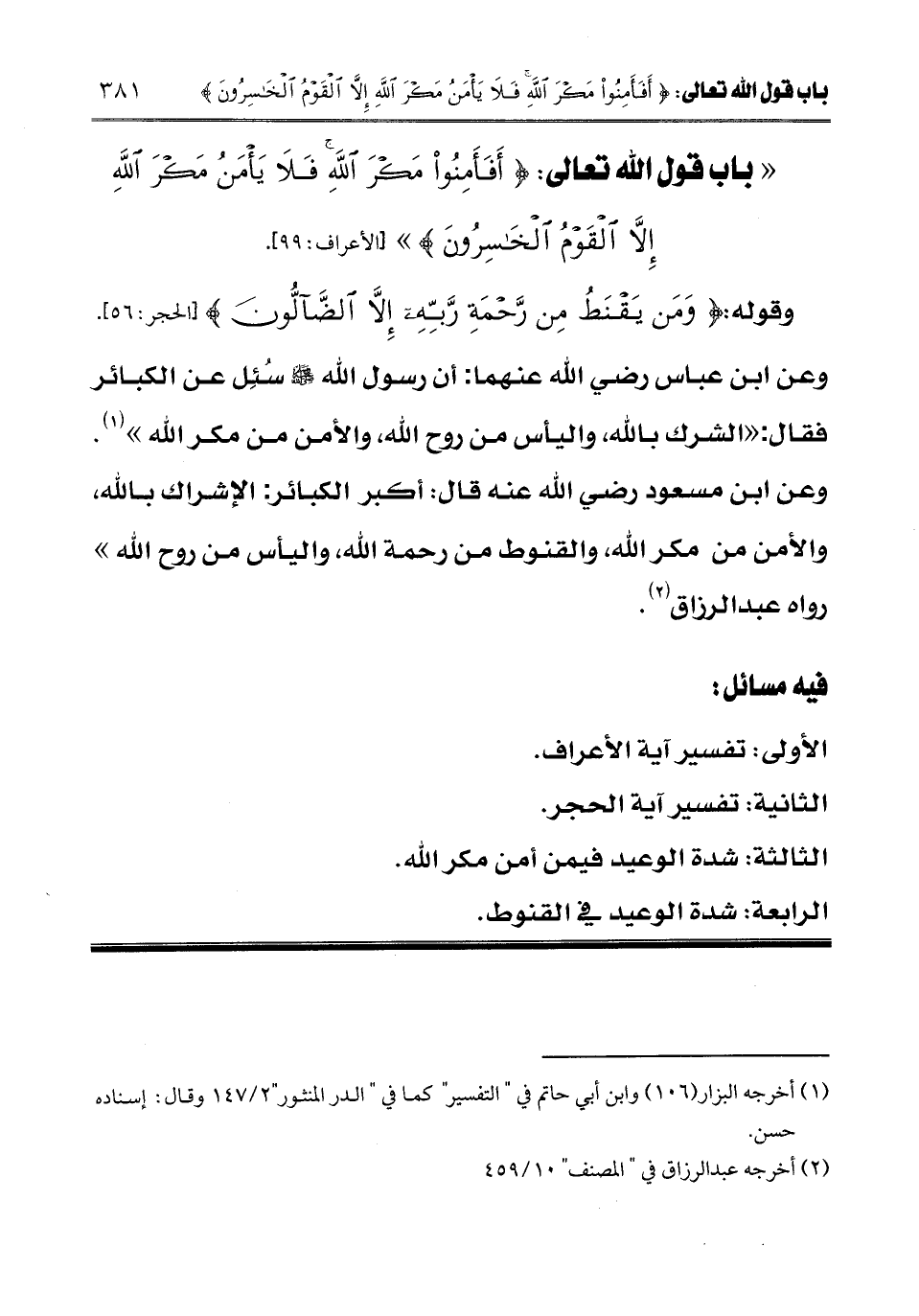 " باب قول الله تعالى: {أَفَأَمِنُوا مَكْرَ اللَّهِ فَلَا يَأْمَنُ مَكْرَ اللَّهِ إِلَّا الْقَوْمُ الْخَاسِرُونَ} [الأعراف: 99] [الأعراف: 99] . وقوله: {وَمَنْ يَقْنَطُ مِنْ رَحْمَةِ رَبِّهِ إِلَّا الضَّالُّونَ} [الحجر: 56] [الحجر: 56] .