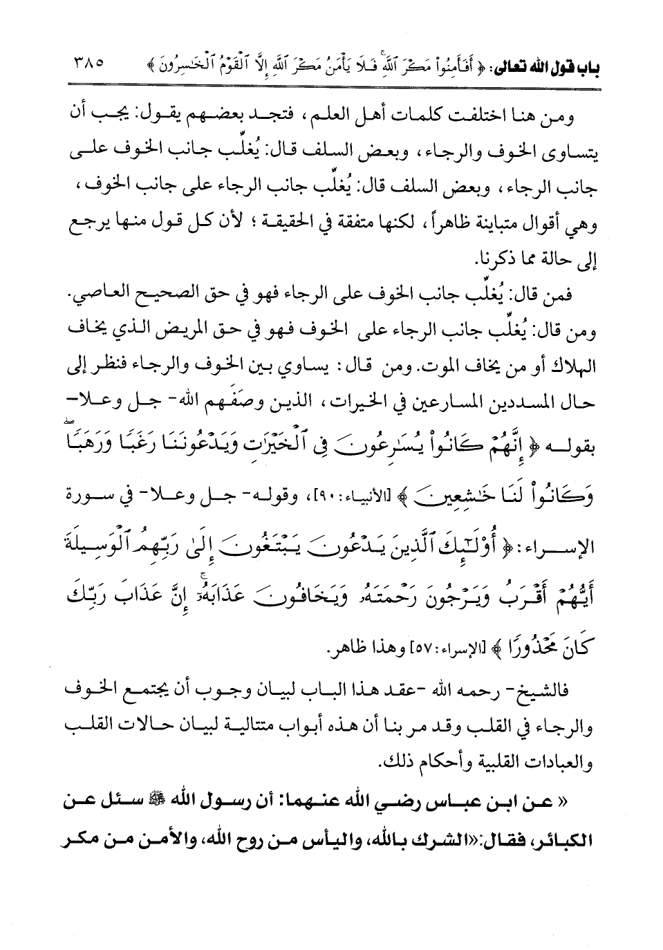 فالشيخ - رحمه الله - عقد هذا الباب لبيان وجوب أن يجتمع الخوف والرجاء في القلب، وقد مر بنا أن هذه أبواب متتالية لبيان حالات القلب والعبادات القلبية وأحكام ذلك.