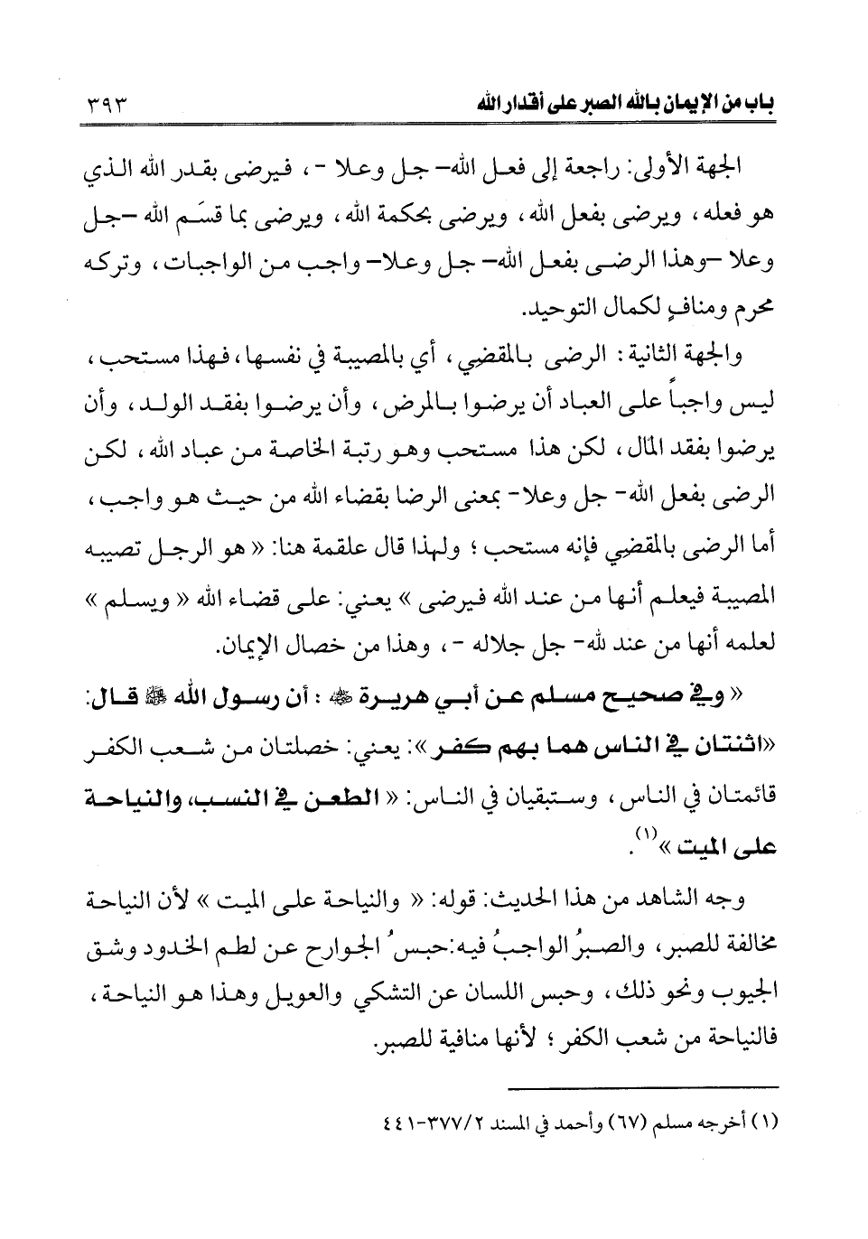 والجهة الثانية: الرضا بالمقضي، أي بالمصيبة في نفسها، فهذا مستحب، ليس واجبا على العباد أن يرضوا بالمرض، وأن يرضوا بفقد الولد، وأن يرضوا بفقد المال، لكن هذا مستحب وهو رتبة الخاصة من عباد الله، لكن الرضا بفعل الله - جل وعلا - بمعنى الرضا بقضاء الله من حيث هو واجب، أما الرضا بالمقضي فإنه مستحب؛ ولهذا قال علقمة هنا: " هو الرجل تصيبه المصيبة فيعلم أنها من عند الله فيرضى " يعني: على قضاء الله " ويسلم " لعلمه أنها من عند الله - جل جلاله -، وهذا من خصال الإيمان.