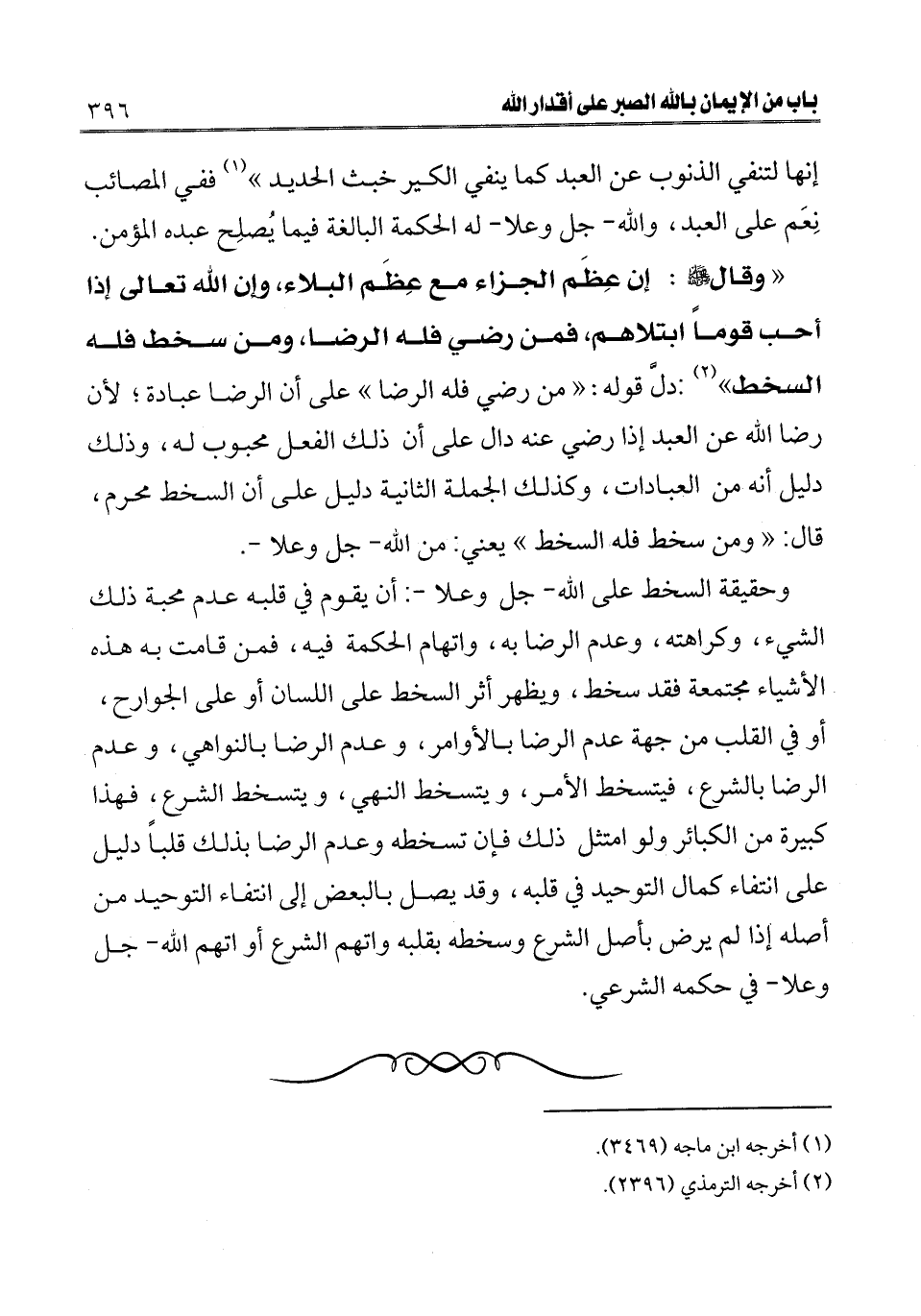 " وقال صلى الله عليه وسلم: «إن عظم الجزاء مع عظم البلاء، وإن الله تعالى إذا أحب قوما ابتلاهم، فمن رضي فله الرضا، ومن سخط فله السخط» (¬2) دل قوله: " من رضي فله الرضا " على أن الرضا عبادة؛ لأن رضا الله عن العبد إذا رضي عنه دال على أن ذلك الفعل محبوب له، وذلك دليل أنه من العبادات، وكذلك الجملة الثانية دليل على أن السخط محرم، قال: " ومن سخط فله السخط " يعني: من الله - جل وعلا -.