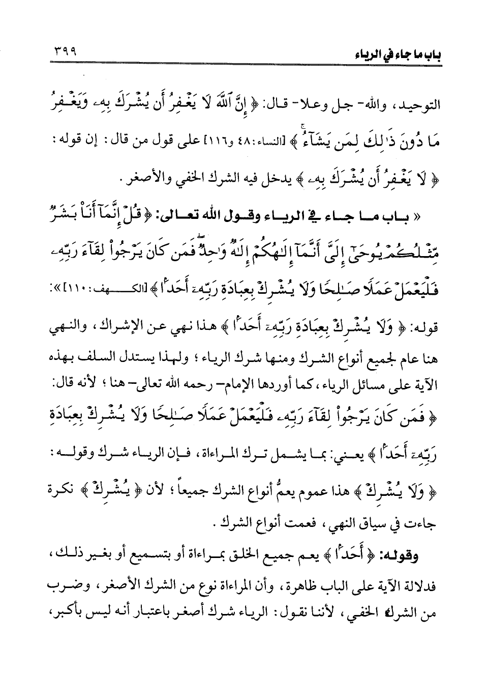 " باب ما جاء في الرياء، وقول الله تعالى: {قُلْ إِنَّمَا أَنَا بَشَرٌ مِثْلُكُمْ يُوحَى إِلَيَّ أَنَّمَا إِلَهُكُمْ إِلَهٌ وَاحِدٌ فَمَنْ كَانَ يَرْجُوا لِقَاءَ رَبِّهِ فَلْيَعْمَلْ عَمَلا صَالِحًا وَلا يُشْرِكْ بِعِبَادَةِ رَبِّهِ أَحَدًا} [الكهف: 110] [الكهف: 110] ، قوله. {وَلَا يُشْرِكْ بِعِبَادَةِ رَبِّهِ أَحَدًا} [الكهف: 110] هذا نهي عن الإشراك، والنهي هنا عام لجميع أنواع الشرك ومنها شرك الرياء، ولهذا يستدل السلف بهذه الآية على مسائل الرياء، كما أوردها الإمام - رحمه الله تعالى - هنا؛ لأنه. قال: {فَمَنْ كَانَ يَرْجُوا لِقَاءَ رَبِّهِ فَلْيَعْمَلْ عَمَلًا صَالِحًا وَلَا يُشْرِكْ بِعِبَادَةِ رَبِّهِ أَحَدًا} [الكهف: 110] يعني: بما يشمل ترك المراءاة، فإن الرياء شرك، وقوله: {وَلَا يُشْرِكْ} [الكهف: 110] هذا عموم يعم أنواع الشرك جميعا؛ لأن {يُشْرِكْ} [الكهف: 110] نكرة جاءت في سياق النهي، فعمت أنواع الشرك.
