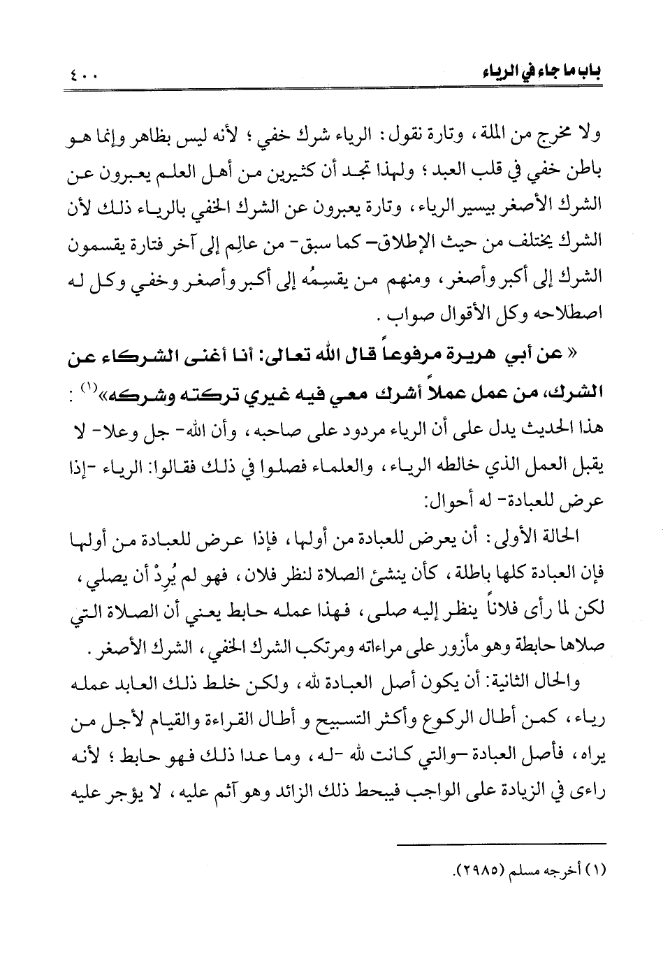 " عن أبي هريرة مرفوعا، «قال الله تعالى: أنا أغنى الشركاء عن الشرك، من عمل عملا أشرك معي فيه غيري تركته وشركه» (¬1) هذا الحديث يدل على أن الرياء مردود على صاحبه، وأن الله - جل وعلا - لا يقبل العمل الذي خالطه الرياء، والعلماء فصلوا في ذلك فقالوا: الرياء - إذا عرض للعبادة - له أحوال: