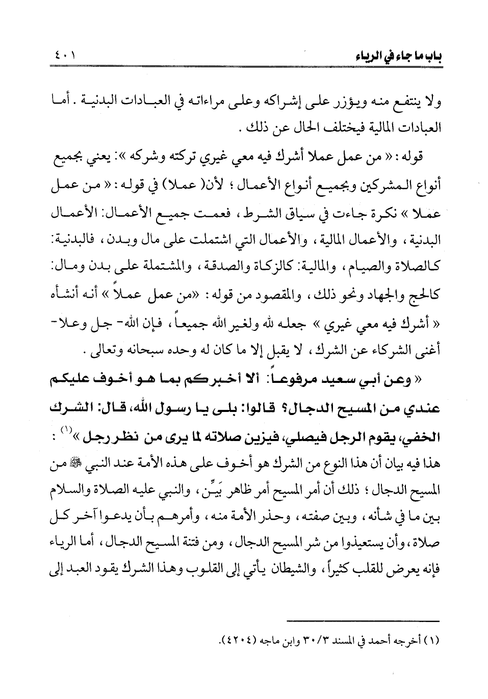 " وعن أبي سعيد مرفوعا: «ألا أخبركم بما هو أخوف عليكم عندي من المسيح الدجال؟ قالوا: بلى يا رسول الله، قال: الشرك الخفي، يقوم الرجل فيصلي، فيزين صلاته لما يرى من نظر رجل» (¬1) هذا فيه بيان أن هذا النوع من الشرك هو أخوف على هذه الأمة عند النبي صلى الله عليه وسلم من المسيح الدجال؛ ذلك أن أمر المسيح أمر ظاهر بين، والنبي عليه الصلاة والسلام بين ما في شأنه، وبين صفته، وحذر الأمة منه، وأمرهم بأن يدعوا آخر كل صلاة، وأن يستعيذوا من شر المسيح الدجال، ومن فتنة المسيح الدجال، أما الرياء فإنه يعرض للقلب كثيرا، والشيطان يأتي إلى القلوب، وهذا الشرك يقود العبد إلى