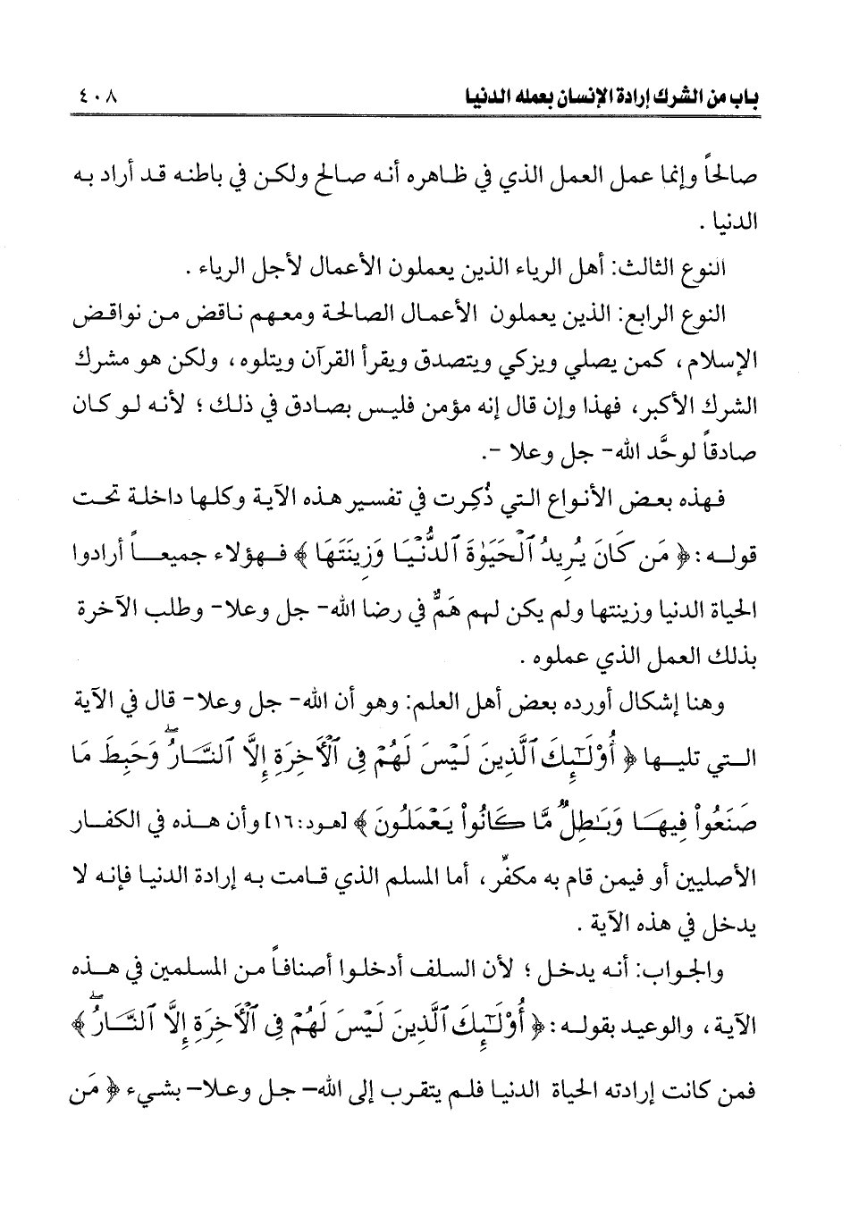 وهنا إشكال أورده بعض أهل العلم: وهو أن الله - جل وعلا - قال في الآية التي تليها {أُولَئِكَ الَّذِينَ لَيْسَ لَهُمْ فِي الْآخِرَةِ إِلَّا النَّارُ وَحَبِطَ مَا صَنَعُوا فِيهَا وَبَاطِلٌ مَا كَانُوا يَعْمَلُونَ} [هود: 16] [هود: 16] ، وأن هذه في الكفار الأصليين أو فيمن قام به مكفر، أما المسلم الذي قامت به إرادة الدنيا فإنه لا يدخل في هذه الآية.