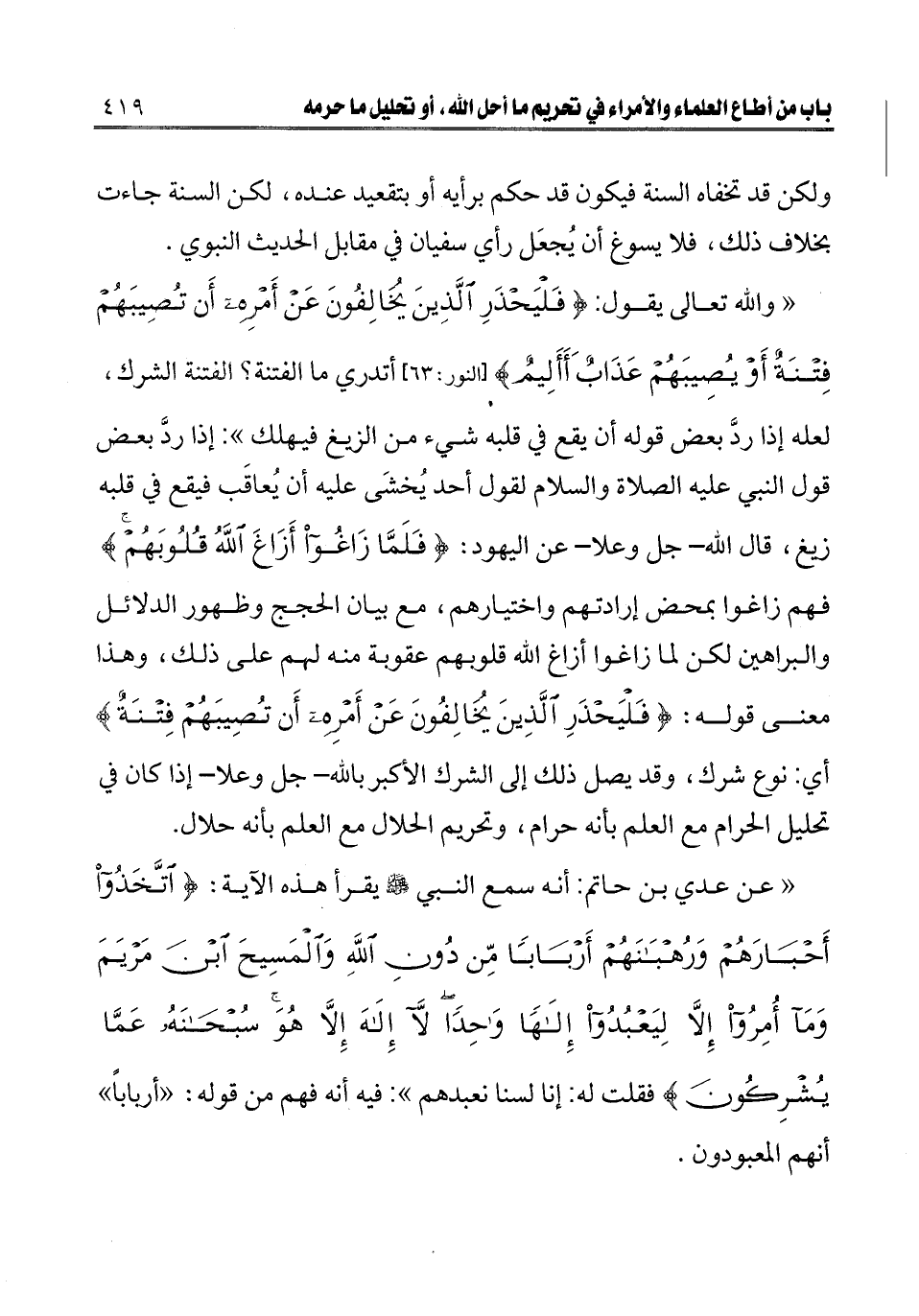 " عن عدي بن حاتم: «أنه سمع النبي صلى الله عليه وسلم يقرأ هذه الآية: {اتَّخَذُوا أَحْبَارَهُمْ وَرُهْبَانَهُمْ أَرْبَابًا مِنْ دُونِ اللَّهِ وَالْمَسِيحَ ابْنَ مَرْيَمَ وَمَا أُمِرُوا إِلَّا لِيَعْبُدُوا إِلَهًا وَاحِدًا لَا إِلَهَ إِلَّا هُوَ سُبْحَانَهُ عَمَّا يُشْرِكُونَ} [التوبة: 31] فقلت له: إنا لسنا نعبدهم» : فيه أنه فهم من قوله: {أَرْبَابًا} [التوبة: 31] أنهم المعبودون.