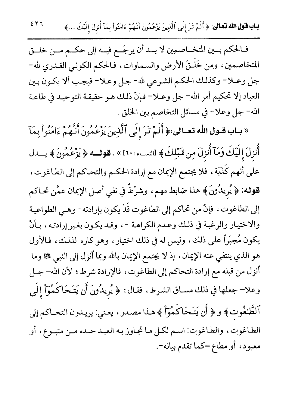 " باب قول الله تعالى: {أَلَمْ تَرَ إِلَى الَّذِينَ يَزْعُمُونَ أَنَّهُمْ آمَنُوا بِمَا أُنْزِلَ إِلَيْكَ وَمَا أُنْزِلَ مِنْ قَبْلِكَ} [النساء: 60] [النساء: 60] ": قوله {يَزْعُمُونَ} [النساء: 60] يدل على أنهم كذبة، فلا يجتمع الإيمان مع إرادة الحكم والتحاكم إلى الطاغوت، قوله: (يريدون) هذا ضابط مهم، وشرط في نفي أصل الإيمان عمن تحاكم إلى الطاغوت، فإن من تحاكم إلى الطاغوت قد يكون بإرادته - وهي الطواعية والاختيار والرغبة في ذلك وعدم الكراهة -، وقد يكون بغير إرادته، بأن يكون مجبرا على ذلك، وليس له في ذلك اختيار، وهو كاره لذلك، فالأول هو الذي ينتفي عنه الإيمان، إذ لا يجتمع الإيمان بالله وبما أنزل إلى النبي صلى الله عليه وسلم وما أنزل من قبله مع إرادة التحاكم إلى الطاغوت، فالإرادة شرط؛ لأن الله - جل وعلا - جعلها في ذلك مساق الشرط، فقال: {يُرِيدُونَ أَنْ يَتَحَاكَمُوا إِلَى الطَّاغُوتِ} [النساء: 60] و {أَنْ يَتَحَاكَمُوا} [النساء: 60] هذا مصدر، يعني: يريدون التحاكم إلى الطاغوت، والطاغوت. اسم لكل ما تجاوز به العبد حده من متبوع، أو معبود، أو مطاع - كما تقدم بيانه -.