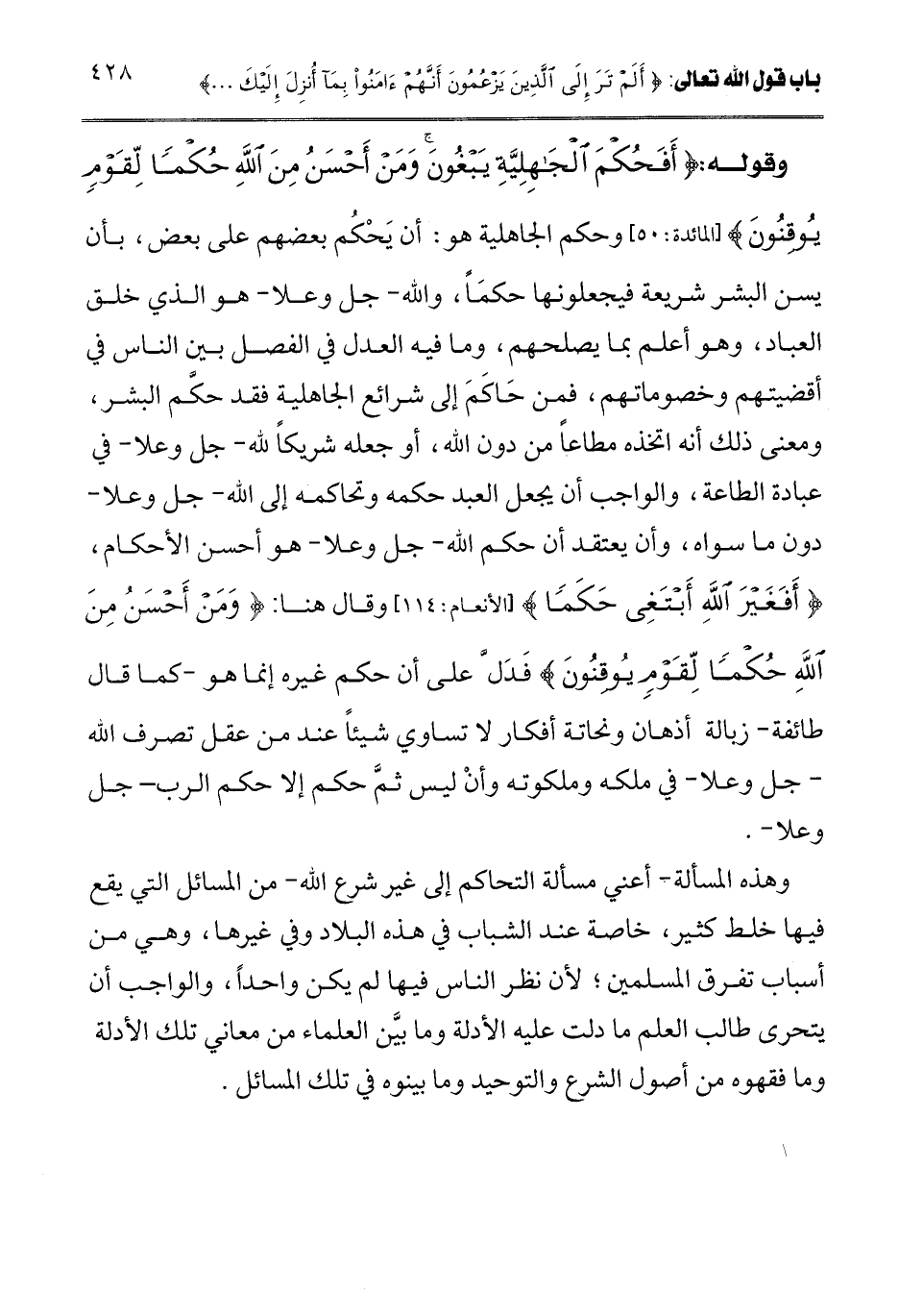 ـــــــــــــــــــــــــــــQوقوله: {أَفَحُكْمَ الْجَاهِلِيَّةِ يَبْغُونَ وَمَنْ أَحْسَنُ مِنَ اللَّهِ حُكْمًا لِقَوْمٍ يُوقِنُونَ} [المائدة: 50] [المائدة: 50] وحكم الجاهلية هو: أن يحكم بعضهم على بعض، بأن يسن البشر شريعة فيجعلونها حكما، والله - جل وعلا - هو الذي خلق العباد، وهو أعلم بما يصلحهم، وما فيه العدل في الفصل بين الناس في أقضيتهم وخصوماتهم، فمن حاكم إلى شرائع الجاهلية فقد حكم البشر، ومعنى ذلك أنه اتخذه مطاعا من دون الله، أو جعله شريكا لله - جل وعلا - في عبادة الطاعة، والواجب أن يجعل العبد حكمه وتحاكمه إلى الله - جل وعلا - دون ما سواه، وأن يعتقد أن حكم الله - جل وعلا - هو أحسن الأحكام، {أَفَغَيْرَ اللَّهِ أَبْتَغِي حَكَمًا} [الأنعام: 114] [الأنعام: 114] وقال هنا: {وَمَنْ أَحْسَنُ مِنَ اللَّهِ حُكْمًا لِقَوْمٍ يُوقِنُونَ} [المائدة: 50] فدل على أن حكم غيره إنما هو - كما قال طائفة - زبالة أذهان ونحاتة أفكار لا تساوي شيئا عند من عقل تصرف الله - جل وعلا - في ملكه وملكوته وأن ليس ثم حكم إلا حكم الرب - جل وعلا -.