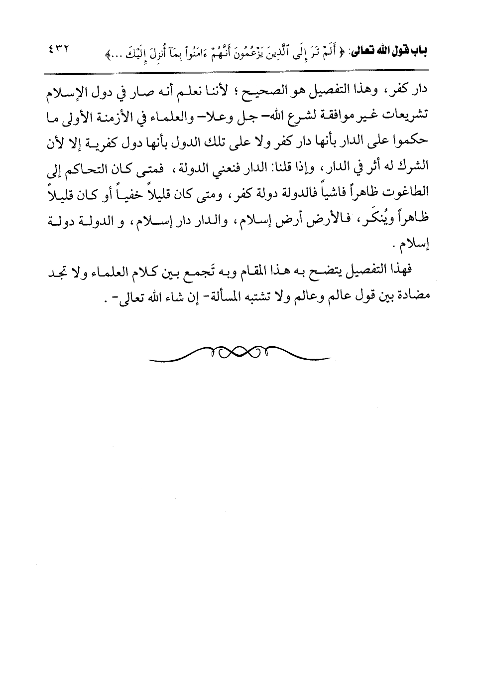 ـــــــــــــــــــــــــــــQدار كفر، وهذا التفصيل هو الصحيح؛ لأننا نعلم أنه صار في دول الإسلام تشريعات غير موافقة لشرع الله - جل وعلا - والعلماء في الأزمنة الأولى ما حكموا على الدار بأنها دار كفر ولا على تلك الدول بأنها دول كفرية إلا لأن الشرك له أثر في الدار، وإذا قلنا: الدار فنعني الدولة، فمتى كان التحاكم إلى الطاغوت ظاهرا فاشيا فالدولة دولة كفر، ومتى كان قليلا خفيا أو كان قليلا ظاهرا وينكر، فالأرض أرض إسلام، والدار دار إسلام، والدولة دولة إسلام.
