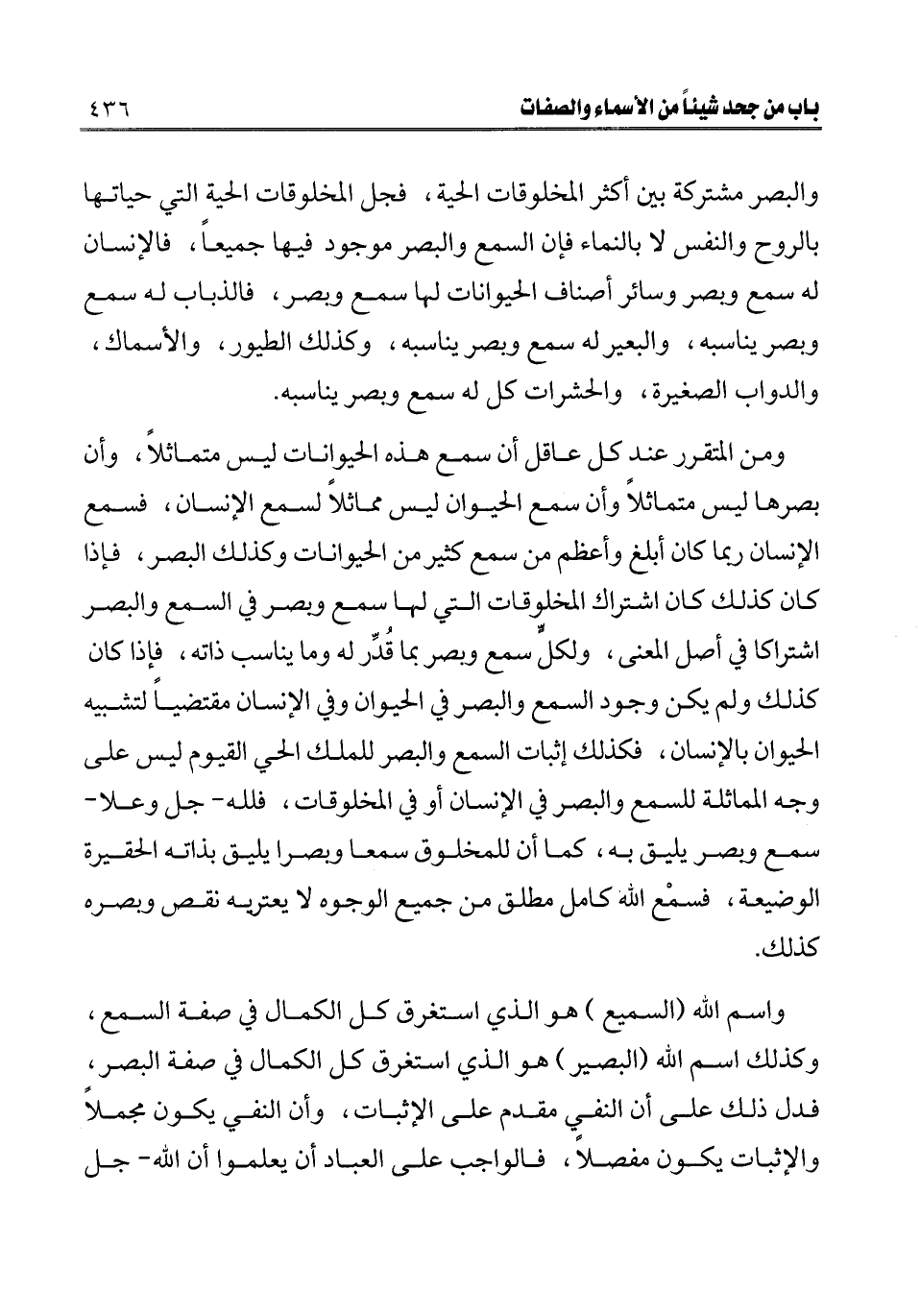 ومن المتقرر عند كل عاقل أن سمع هذه الحيوانات ليس متماثلا، وأن بصرها ليس متماثلا وأن سمع الحيوان ليس مماثلا لسمع الإنسان، فسمع الإنسان ربما كان أبلغ وأعظم من سمع كثير من الحيوانات وكذلك البصر، فإذا كان كذلك كان اشتراك المخلوقات التي لها سمع وبصر في السمع والبصر اشتراكا في أصل المعنى، ولكل سمع وبصر بما قدر له وما يناسب ذاته، فإذا كان كذلك ولم يكن وجود السمع والبصر في الحيوان وفي الإنسان مقتضيا لتشبيه الحيوان بالإنسان، فكذلك إثبات السمع والبصر للملك الحي القيوم ليس على وجه المماثلة للسمع والبصر في الإنسان أو في المخلوقات، فلله - جل وعلا - سمع وبصر يليق به، كما أن للمخلوق سمعا وبصرا يليق بذاته الحقيرة الوضيعة، فسمع الله كامل مطلق من جميع الوجوه لا يعتريه نقص وبصره كذلك.