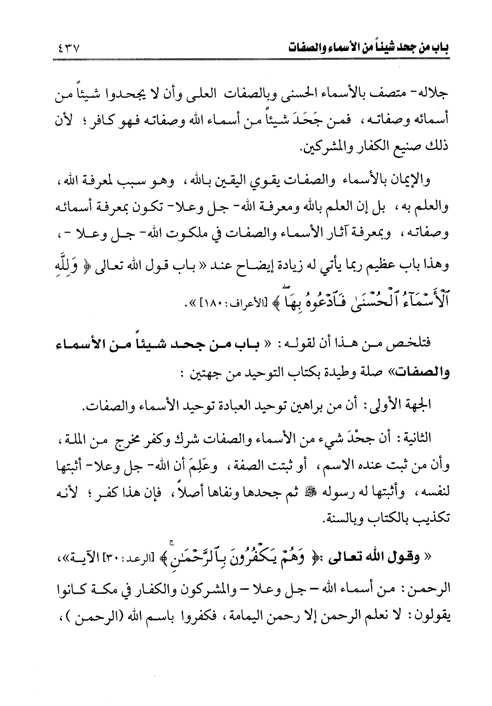 فتلخص من هذا أن لقوله: " باب من جحد شيئا من الأسماء والصفات " صلة وطيدة بكتاب التوحيد من جهتين: