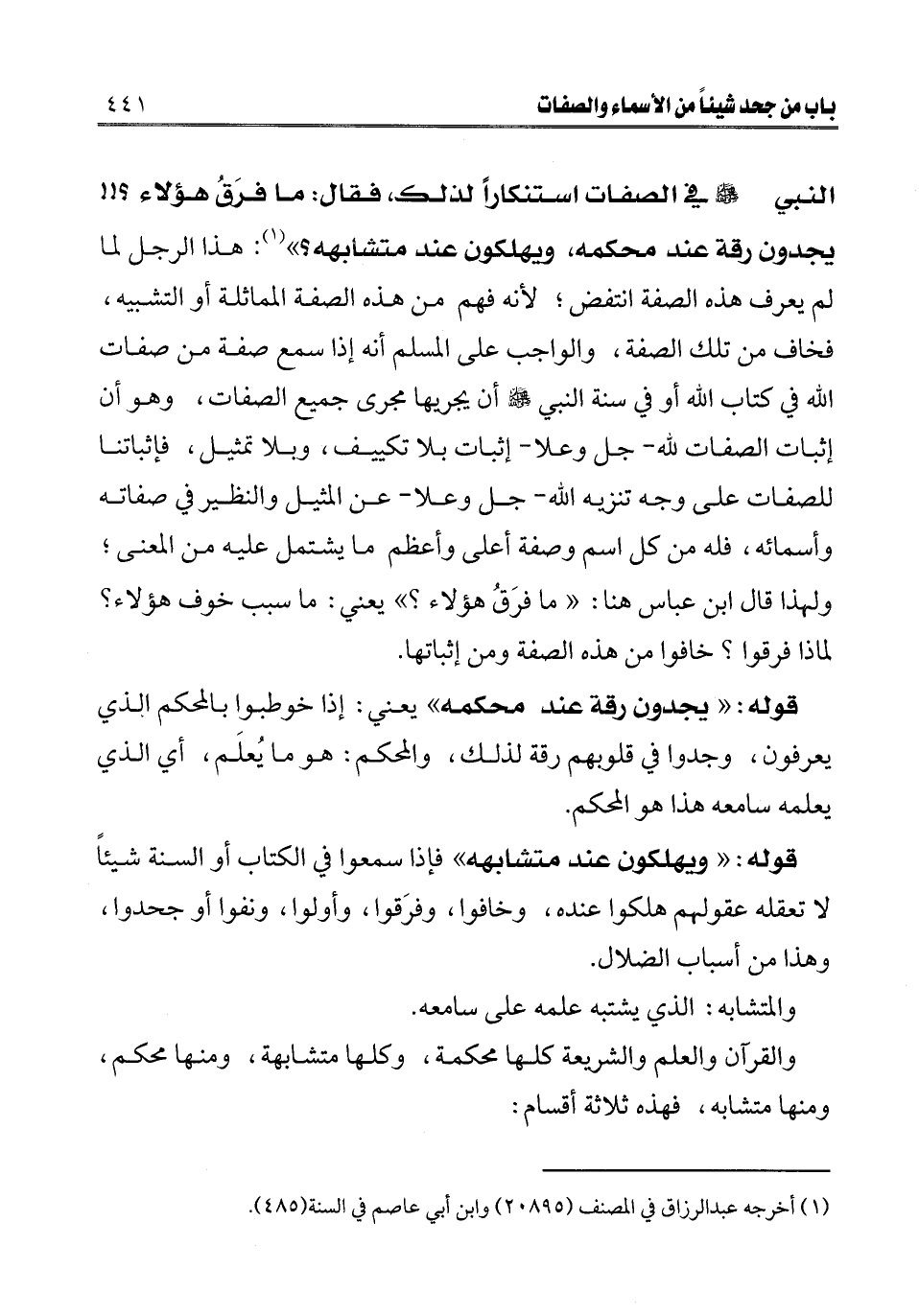 ـــــــــــــــــــــــــــــQالنبي صلى الله عليه وسلم في الصفات استنكارا لذلك، فقال: ما فرق هؤلاء؟!! يجدون رقة عند محكمه، ويهلكون عند متشابهه؟ " (¬1) هذا الرجل لما لم يعرف هذه الصفة انتفض؛ لأنه فهم من هذه الصفة المماثلة أو التشبيه، فخاف من تلك الصفة، والواجب على المسلم أنه إذا سمع صفة من صفات الله في كتاب الله أو في سنة النبي صلى الله عليه وسلم أن يجريها مجرى جميع الصفات، وهو أن إثبات الصفات لله - جل وعلا - إثبات بلا تكييف، وبلا تمثيل، فإثباتنا للصفات على وجه تنزيه الله - جل وعلا - عن المثيل والنظير في صفاته وأسمائه، فله من كل اسم وصفة أعلى وأعظم ما يشتمل عليه من المعنى؛ ولهذا قال ابن عباس هنا: " ما فرق هؤلاء؟ " يعني: ما سبب خوف هؤلاء؟ لماذا فرقوا؟ خافوا من هذه الصفة ومن إثباتها.