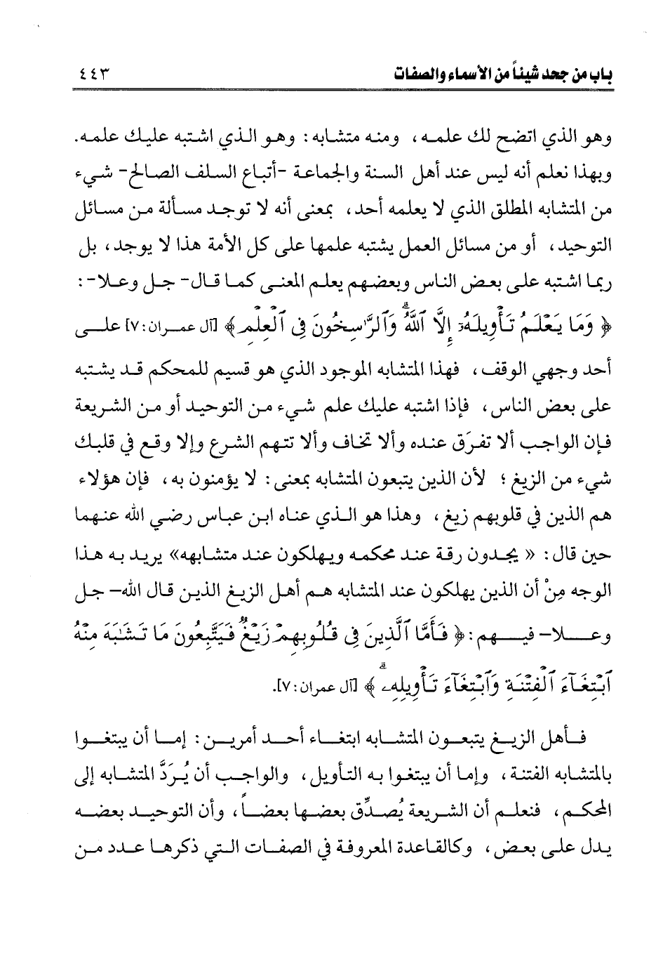 ـــــــــــــــــــــــــــــQوهو الذي اتضح لك علمه، ومنه متشابه: وهو الذي اشتبه عليك علمه. وبهذا نعلم أنه ليس عند أهل السنة والجماعة - أتباع السلف الصالح - شيء من المتشابه المطلق الذي لا يعلمه أحد، بمعنى أنه لا توجد مسألة من مسائل التوحيد، أو من مسائل العمل يشتبه علمها على كل الأمة هذا لا يوجد، بل ربما اشتبه على بعض الناس وبعضهم يعلم المعنى كما قال - جل وعلا -: {وَمَا يَعْلَمُ تَأْوِيلَهُ إِلَّا اللَّهُ وَالرَّاسِخُونَ فِي الْعِلْمِ} [آل عمران: 7] [آل عمران: 7] على أحد وجهي الوقف، فهذا المتشابه الموجود الذي هو قسيم للمحكم قد يشتبه على بعض الناس، فإذا اشتبه عليك علم شيء من التوحيد أو من الشريعة فإن الواجب ألا تفرق عنده وألا تخاف وألا تتهم الشرع وإلا وقع في قلبك شيء من الزيغ؛ لأن الذين يتبعون المتشابه بمعنى: لا يؤمنون به، فإن هؤلاء هم الذين في قلوبهم زيغ، وهذا هو الذي عناه ابن عباس رضي الله عنهما حين قال: " يجدون رقة عند محكمه ويهلكون عند متشابهه " يريد به هذا الوجه من أن الذين يهلكون عند المتشابه هم أهل الزيغ الذين قال الله - جل وعلا - فيهم: {فَأَمَّا الَّذِينَ فِي قُلُوبِهِمْ زَيْغٌ فَيَتَّبِعُونَ مَا تَشَابَهَ مِنْهُ ابْتِغَاءَ الْفِتْنَةِ وَابْتِغَاءَ تَأْوِيلِهِ} [آل عمران: 7] [آل عمران: 7] .