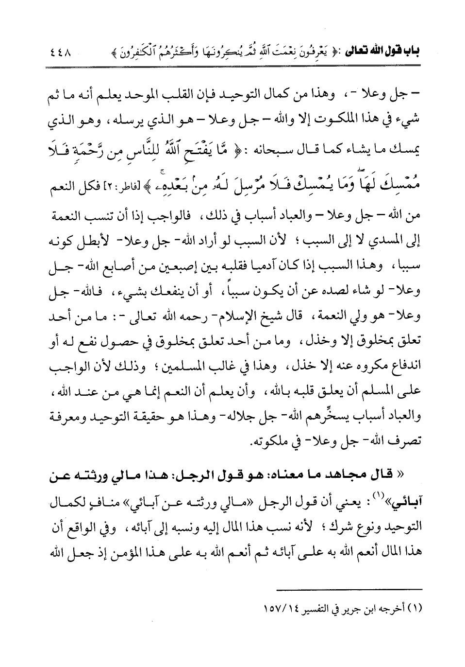 " قال مجاهد ما معناه: هو قول الرجل: هذا مالي ورثته عن آبائي " (¬1) يعني أن قول الرجل " مالي ورثته عن آبائي " مناف لكمال التوحيد ونوع شرك؛ لأنه نسب هذا المال إليه ونسبه إلى آبائه، وفي الواقع أن هذا المال أنعم الله به على آبائه ثم أنعم الله به على هذا المؤمن؛ إذ جعل الله