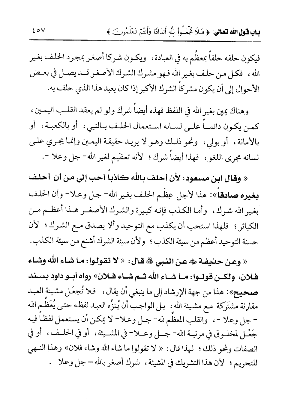" وعن حذيفة رضي الله عنه عن النبي صلى الله عليه وسلم قال: «لا تقولوا: ما شاء الله وشاء فلان، ولكن قولوا: ما شاء الله ثم شاء فلان» رواه أبو داود بسند صحيح ":: هذا من جهة الإرشاد إلى ما ينبغي أن يقال، فلا تجعل مشيئة العبد مقارنة مشتركة مع مشيئة الله، بل الواجب أن ينزه العبد لفظه حتى يعظم الله - جل وعلا -، والقلب المعظم لله - جل وعلا - لا يمكن أن يستعمل لفظا فيه جعل لمخلوق في مرتبة الله - جل وعلا - في المشيئة، أو في الحلف، أو في الصفات ونحو ذلك؛ لهذا قال: «لا تقولوا ما شاء الله وشاء فلان» وهذا النهي للتحريم؛ لأن هذا التشريك في المشيئة، شرك أصغر بالله - جل وعلا -.