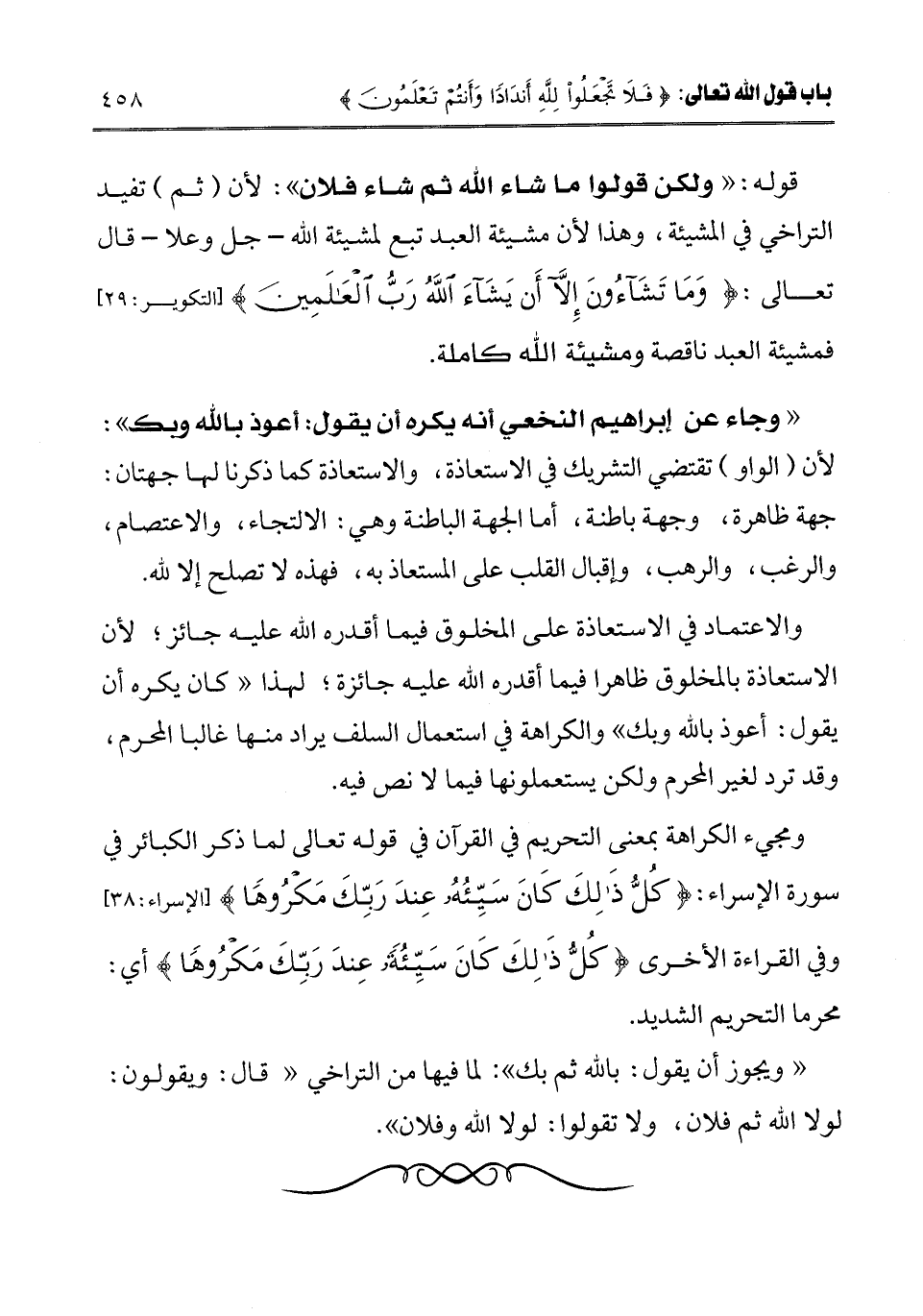 ـــــــــــــــــــــــــــــQقوله: «ولكن قولوا ما شاء الله ثم شاء فلان» : لأن (ثم) تفيد التراخي في المشيئة، وهذا لأن مشيئة العبد تبع لمشيئة الله - جل وعلا - قال تعالى: {وَمَا تَشَاءُونَ إِلَّا أَنْ يَشَاءَ اللَّهُ رَبُّ الْعَالَمِينَ} [التكوير: 29] [التكوير: 29] فمشيئة العبد ناقصة ومشيئة الله كاملة.