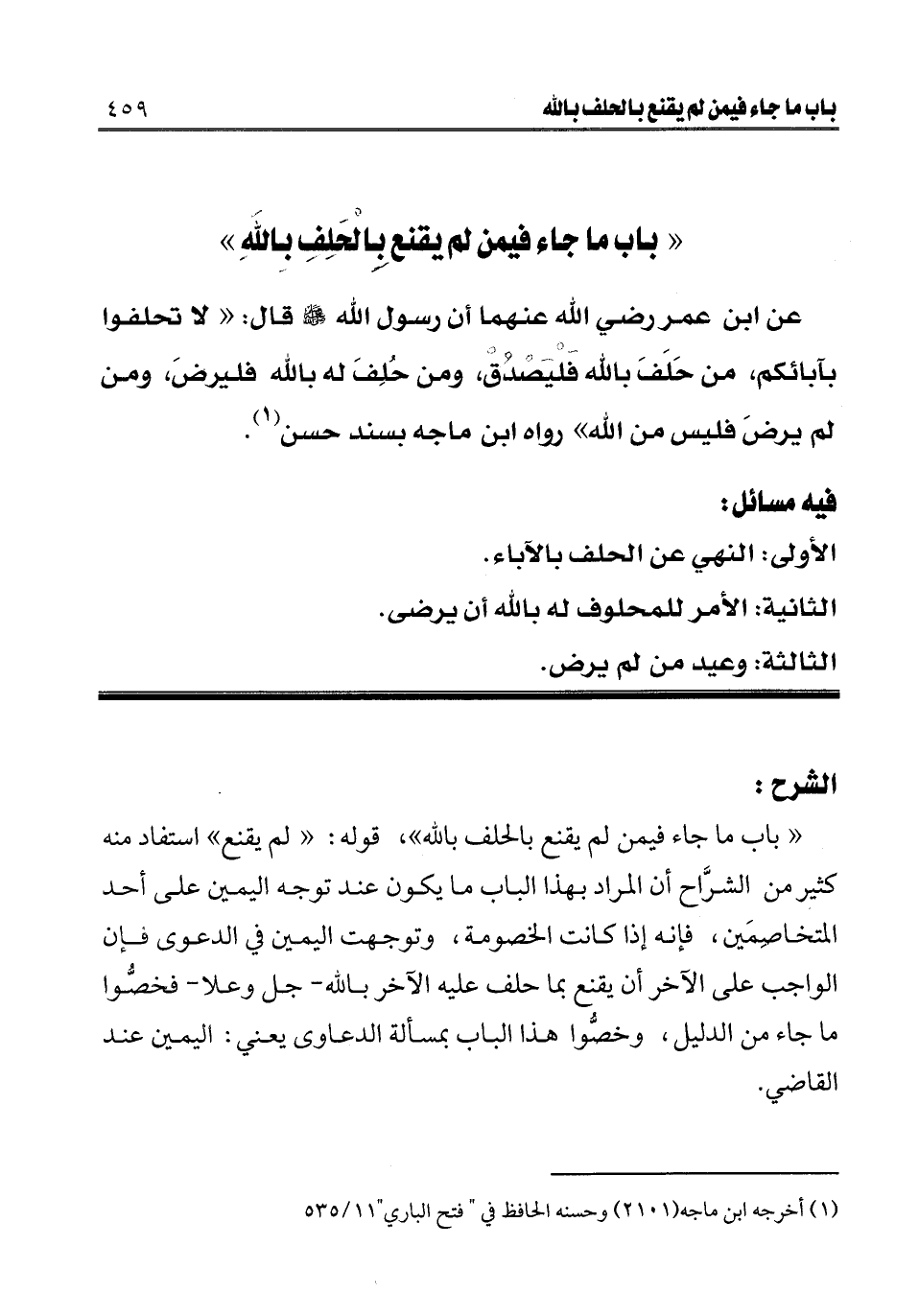 " باب ما جاء فيمن لم يقنع بالحلف بالله" عن ابن عمر رضي الله عنهما أن رسول الله صلى الله عليه وسلم قال: «لا تحلفوا بآبائكم، من حلف بالله فليصدق، ومن حلف له بالله فليرض، ومن لم يرض فليس من الله» . رواه ابن ماجه بسند حسن) (¬1) .