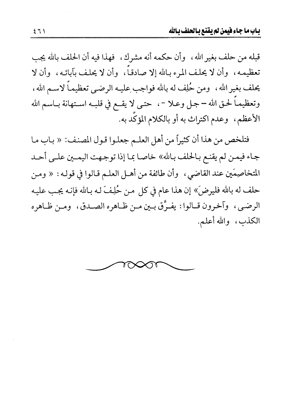 فتلخص من هذا أن كثيرا من أهل العلم جعلوا قول المصنف: " باب ما جاء فيمن لم يقنع بالحلف بالله " خاصا بما إذا توجهت اليمين على أحد المتخاصمين عند القاضي، وأن طائفة من أهل العلم قالوا في قوله: «ومن حلف له بالله فليرض» : إن هذا عام في كل من حلف له بالله، فإنه يجب عليه الرضا، وآخرون قالوا: يفرق بين من ظاهره الصدق، ومن ظاهره الكذب، والله أعلم