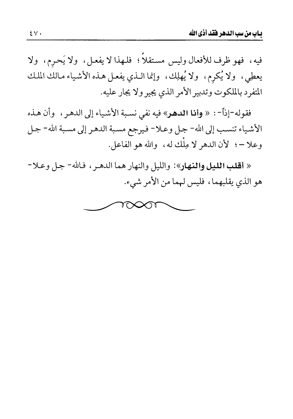 فقوله - إذا -: «وأنا الدهر» فيه نفي نسبة الأشياء إلى الدهر، وأن هذه الأشياء تنسب إلى الله - جل وعلا - فيرجع مسبة الدهر إلى مسبة الله - جل وعلا -؛ لأن الدهر لا ملك له، والله هو الفاعل.