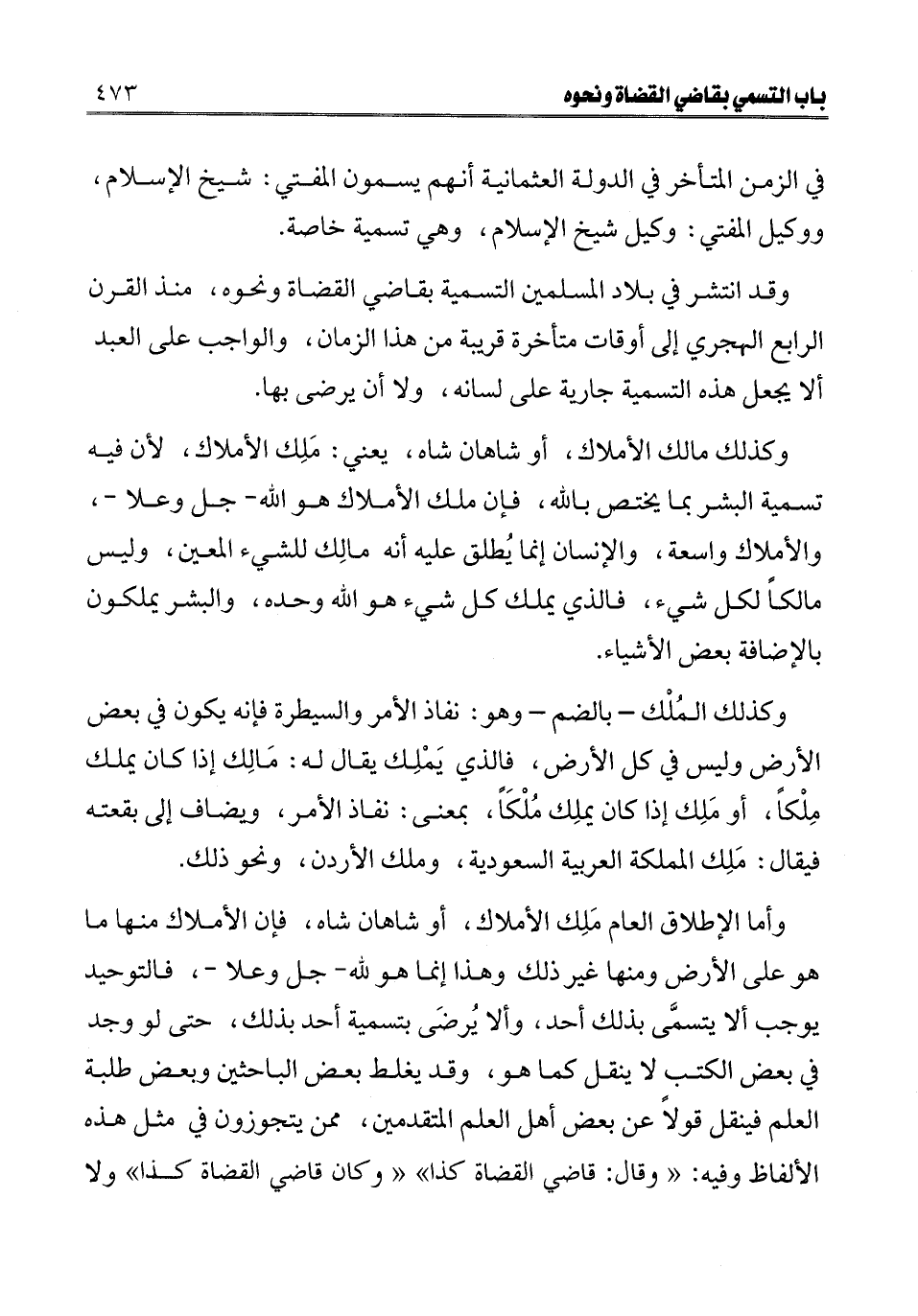 وأما الإطلاق العام ملك الأملاك، أو شاهان شاه، فإن الأملاك منها ما هو على الأرض ومنها غير ذلك وهذا إنما هو لله - جل وعلا -، فالتوحيد يوجب ألا يتسمى بذلك أحد، وألا يرضى بتسمية أحد بذلك، حتى لو وجد في بعض الكتب لا ينقل كما هو، وقد يغلط بعض الباحثين وبعض طلبة العلم فينقل قولا عن بعض أهل العلم المتقدمين، ممن يتجوزون في مثل هذه الألفاظ وفيه: " وقال: قاضي القضاة كذا "، " وكان قاضي القضاة كذا "، ولا