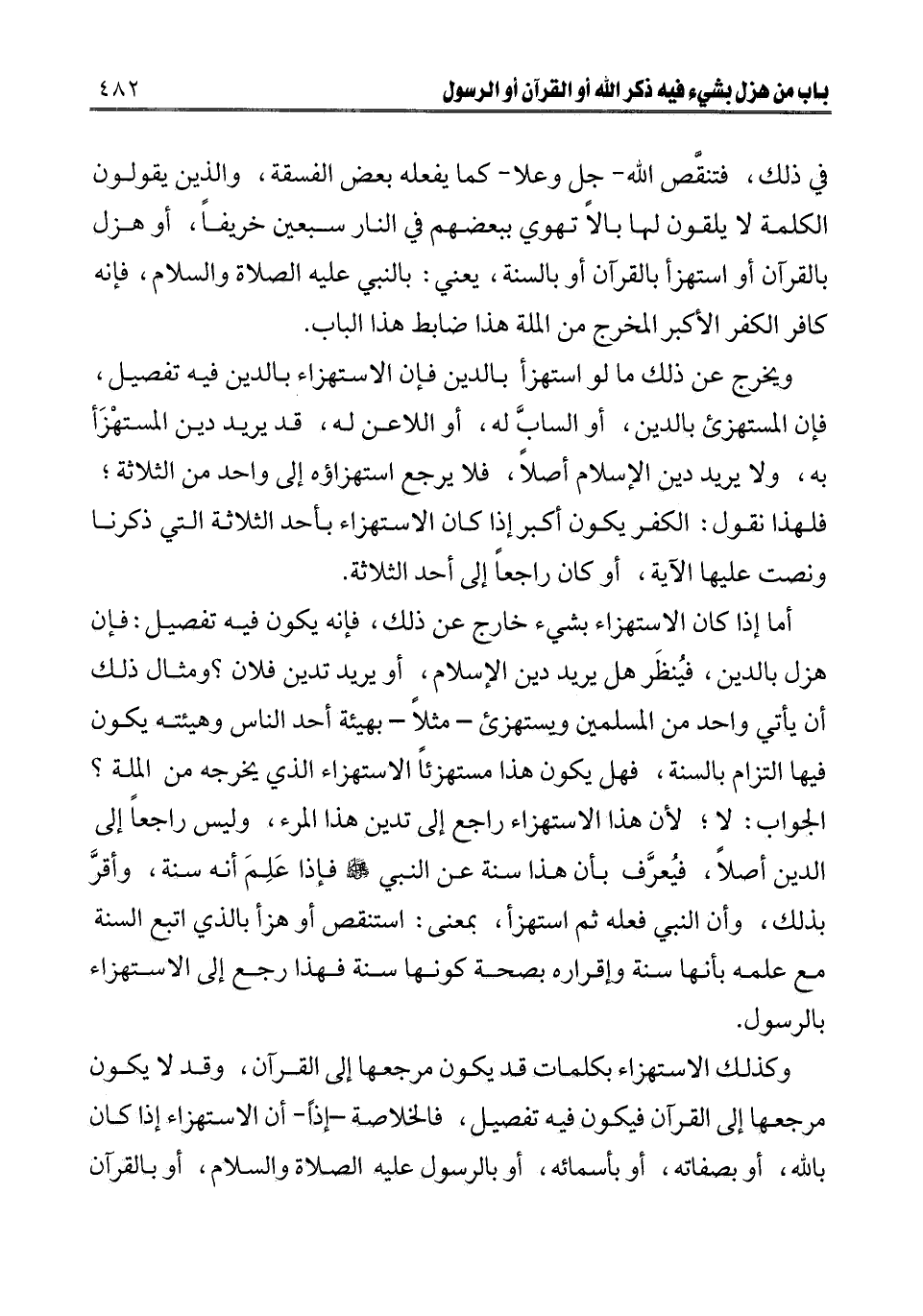 أما إذا كان الاستهزاء بشيء خارج عن ذلك، فإنه يكون فيه تفصيل: فإن هزل بالدين، فينظر هل يريد دين الإسلام، أو يريد تدين فلان؟ ومثال ذلك أن يأتي واحد من المسلمين ويستهزئ- مثلا- بهيئة أحد الناس وهيئته يكون فيها التزام بالسنة، فهل يكون هذا مستهزئا الاستهزاء الذي يخرجه من الملة؟ الجواب: لا؛ لأن هذا الاستهزاء راجع إلى تدين هذا المرء، وليس راجعا إلى الدين أصلا، فيعرف بأن هذا سنة عن النبي صلى الله عليه وسلم فإذا علم أنه سنة، وأقر بذلك، وأن النبي فعله ثم استهزأ، بمعنى: استنقص أو هزأ بالذي اتبع السنة مع علمه بأنها سنة وإقراره بصحة كونها سنه فهذا رجع إلى الاستهزاء بالرسول.