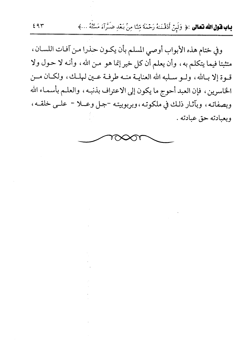 ـــــــــــــــــــــــــــــQوفي ختام هذه الأبواب أوصي المسلم بأن يكون حذرا من آفات اللسان، متثبتا فيما يتكلم به، وأن يعلم أن كل خير إنما هو من الله، وأنه لا حول ولا قوة إلا بالله، ولو سلبه الله العناية منه طرفة عين لهلك، ولكان من الخاسرين، فإن العبد أحوج ما يكون إلى الاعتراف بذنبه، والعلم بأسماء الله وبصفاته، وبآثار ذلك في ملكوته، وبربوبيته- جل وعلا- على خلقه، وبعبادته حق عبادته.