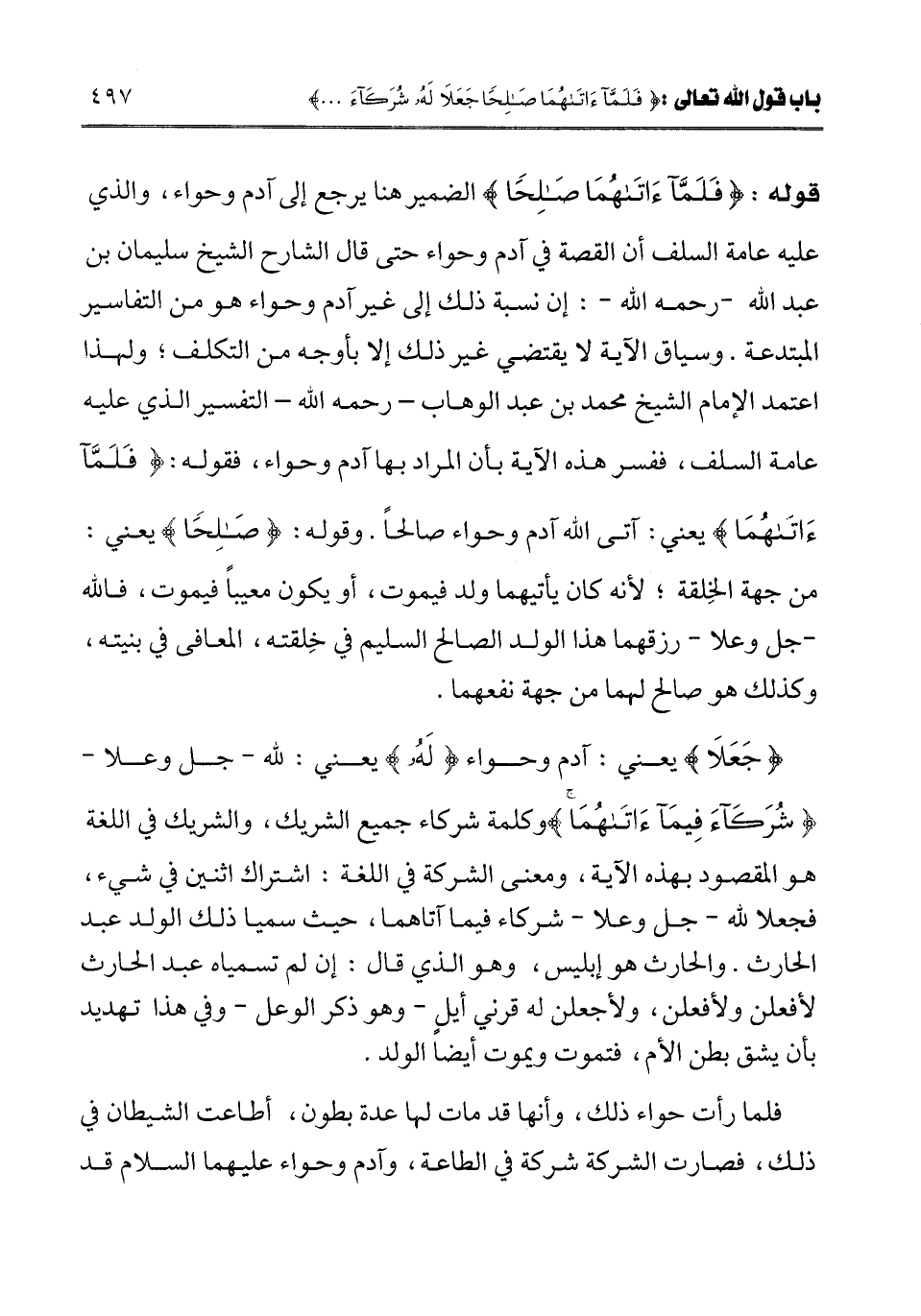 ـــــــــــــــــــــــــــــQقوله: {فَلَمَّا آتَاهُمَا صَالِحًا} [الأعراف: 190] الضمير هنا يرجع إلى آدم وحواء، والذي عليه عامة السلف أن القصة في آدم وحواء حتى قال الشارح الشيخ سليمان بن عبد الله -رحمه الله-: إن نسبة ذلك إلى غير آدم وحواء هو من التفاسير المبتدعة. وسياق الآية لا يقتضي غير ذلك إلا بأوجه من التكلف؛ ولهذا اعتمد الإمام الشيخ محمد بن عبد الوهاب -رحمه الله- التفسير الذي عليه عامة السلف، ففسر هذه الآية بأن المراد بها آدم وحواء، فقوله: {فَلَمَّا آتَاهُمَا} [الأعراف: 190] يعني: آتى الله آدم وحواء صالحا. وقوله: {صَالِحًا} [الأعراف: 190] يعني: من جهة الخلقة؛ لأنه كان يأتيهما ولد فيموت، أو يكون معيبا فيموت، فالله -جل وعلا- رزقهما هذا الولد الصالح السليم في خلقته، المعافى في بنيته، وكذلك هو صالح لهما من جهة نفعهما.