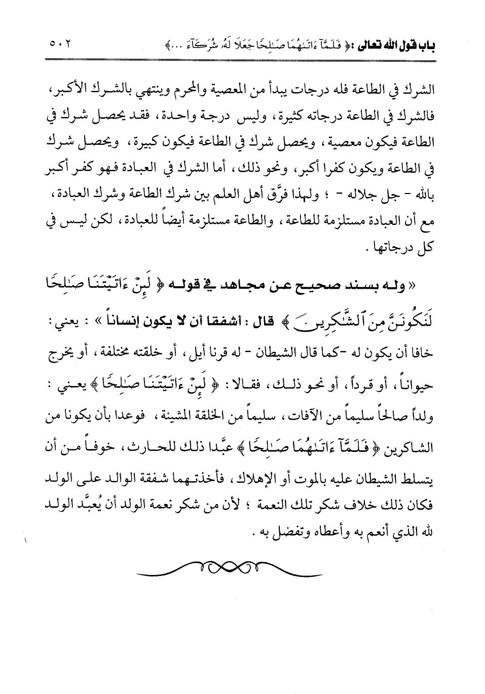 " وله بسند صحيح عن مجاهد في قوله {لَئِنْ آتَيْتَنَا صَالِحًا لَنَكُونَنَّ مِنَ الشَّاكِرِينَ} [الأعراف: 189] قال: أشفقا أن لا يكون إنسانا ": يعني: خافا أن يكون له -كما قال الشيطان- له قرنا أيل، أو خلقته مختلفة، أو يخرج حيوانا، أو قردا، أو نحو ذلك، فقالا: {لَئِنْ آتَيْتَنَا صَالِحًا} [الأعراف: 189] يعني: ولدا صالحا سليما من الآفات، سليما من الخلقة المشينة، فوعدا بأن يكونا من الشاكرين {فَلَمَّا آتَاهُمَا صَالِحًا} [الأعراف: 190] عبدا ذلك للحارث، خوفا من أن يتسلط الشيطان عليه بالموت أو الإهلاك، فأخذتهما شفقة الوالد على الولد فكان ذلك خلاف شكر تلك النعمة؛ لأن من شكر نعمة الولد أن يعبد الولد لله الذي أنعم به وأعطاه وتفضل به.