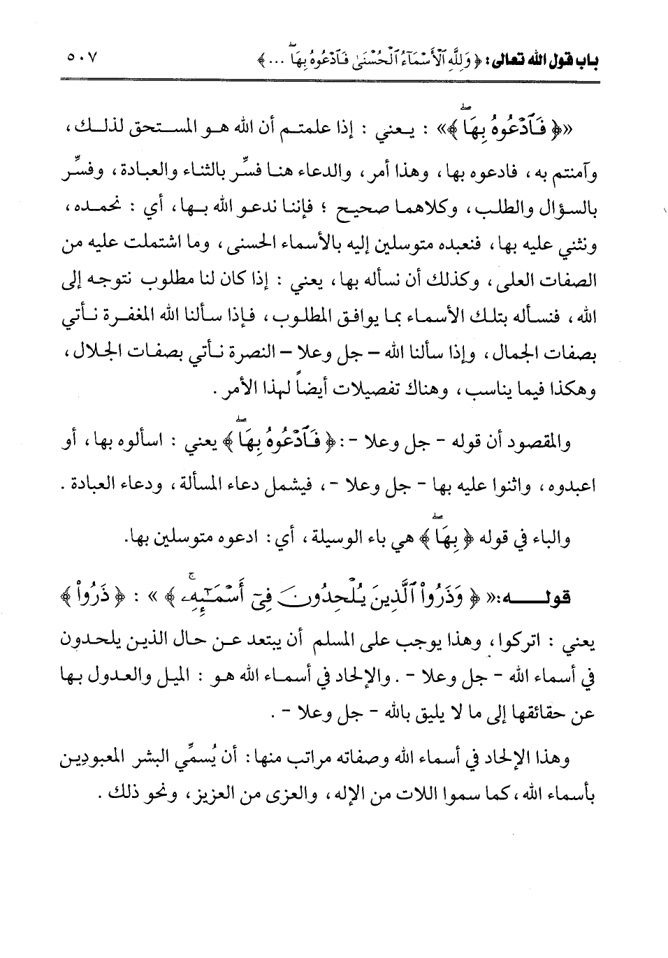 ـــــــــــــــــــــــــــــQ {فَادْعُوهُ بِهَا} [الأعراف: 180] يعني: إذا علمتم أن الله هو المستحق لذلك، وآمنتم به، فادعوه بها، وهذا أمر، والدعاء هنا فسر بالثناء والعبادة، وفسر بالسؤال والطلب، وكلاهما صحيح؛ فإننا ندعو الله بها، أي: نحمده، ونثني عليه بها، فنعبده متوسلين إليه بالأسماء الحسنى، وما اشتملت عليه من الصفات العلى، وكذلك أن نسأله بها، يعني: إذا كان لنا مطلوب نتوجه إلى الله، فنسأله بتلك الأسماء بما يوافق المطلوب، فإذا سألنا الله المغفرة نأتي بصفات الجمال، وإذا سألنا الله- جل وعلا- النصرة نأتي بصفات الجلال، وهكذا فيما يناسب، وهناك تفصيلات أيضا لهذا الأمر.